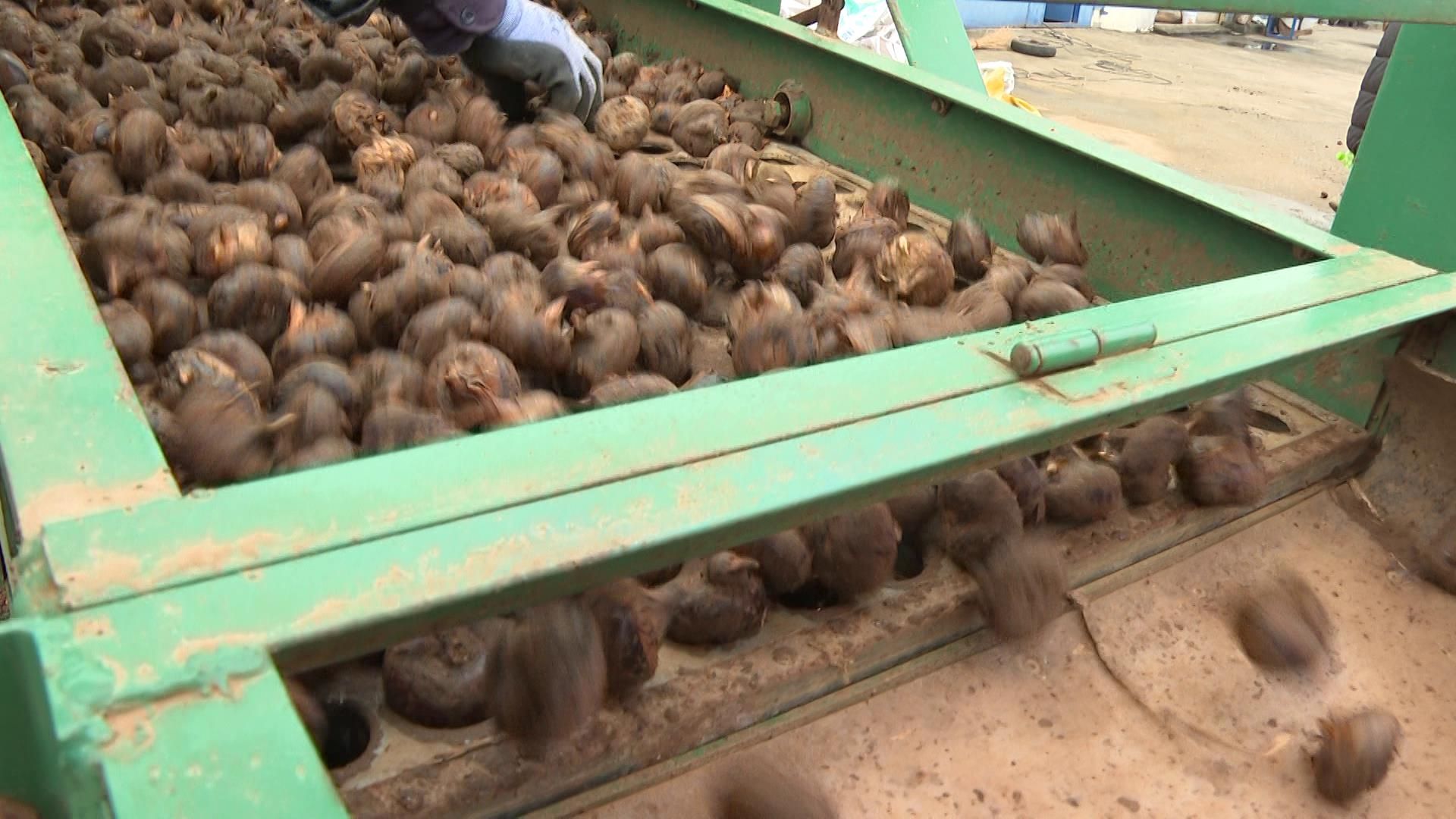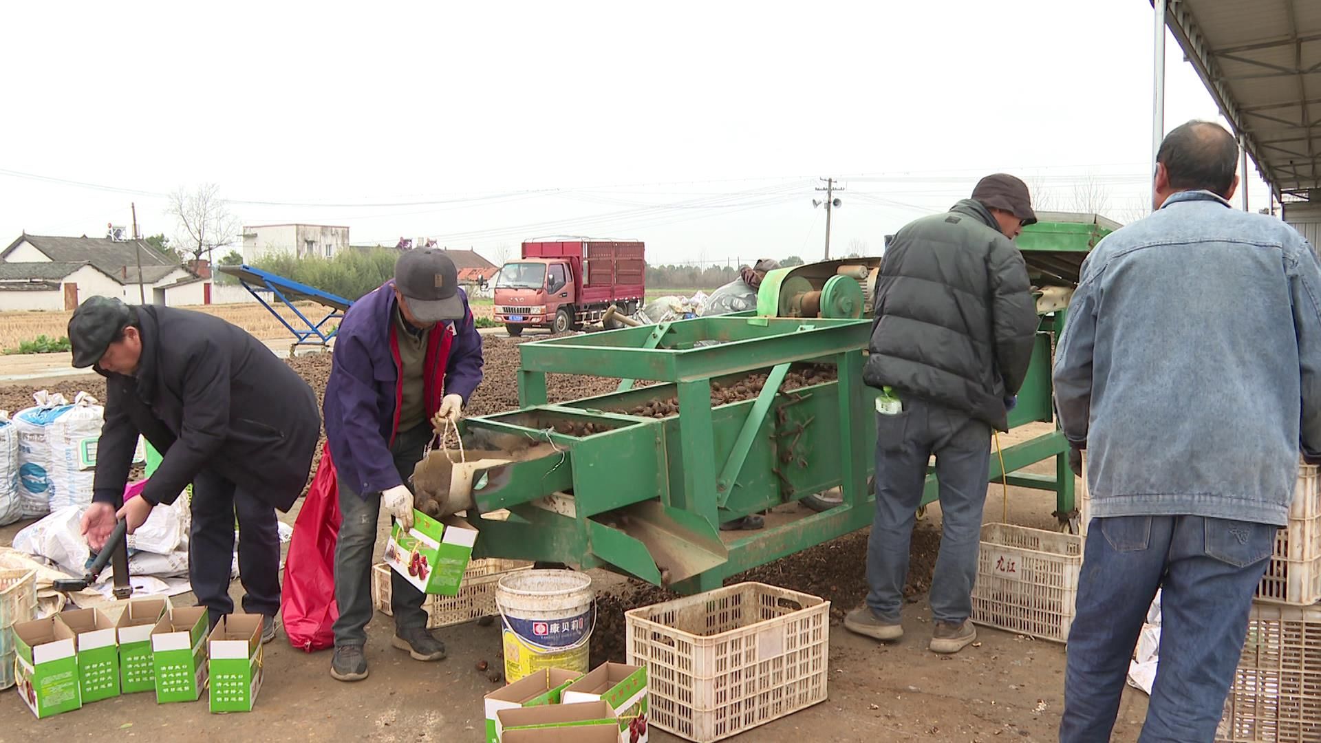 合作社场院内,马蹄被均匀摊开晾晒,随后经过自动化分级机的筛选,按大、中、小不同规格装箱。这些装好的马蹄,将被发往全国各地。从田间到车间的流水线作业,确保了马蹄的新鲜品质与高效供应。