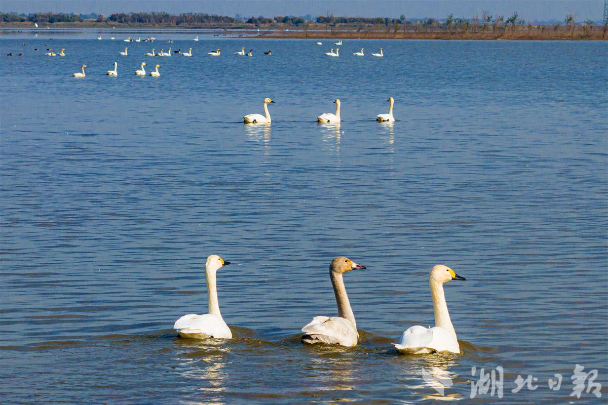 2025年11月30日,在湖南岳阳洞庭湖浅水区域,来自西伯利亚的天鹅在此越冬,数量众多。(湖北日报全媒记者 任勇 摄)