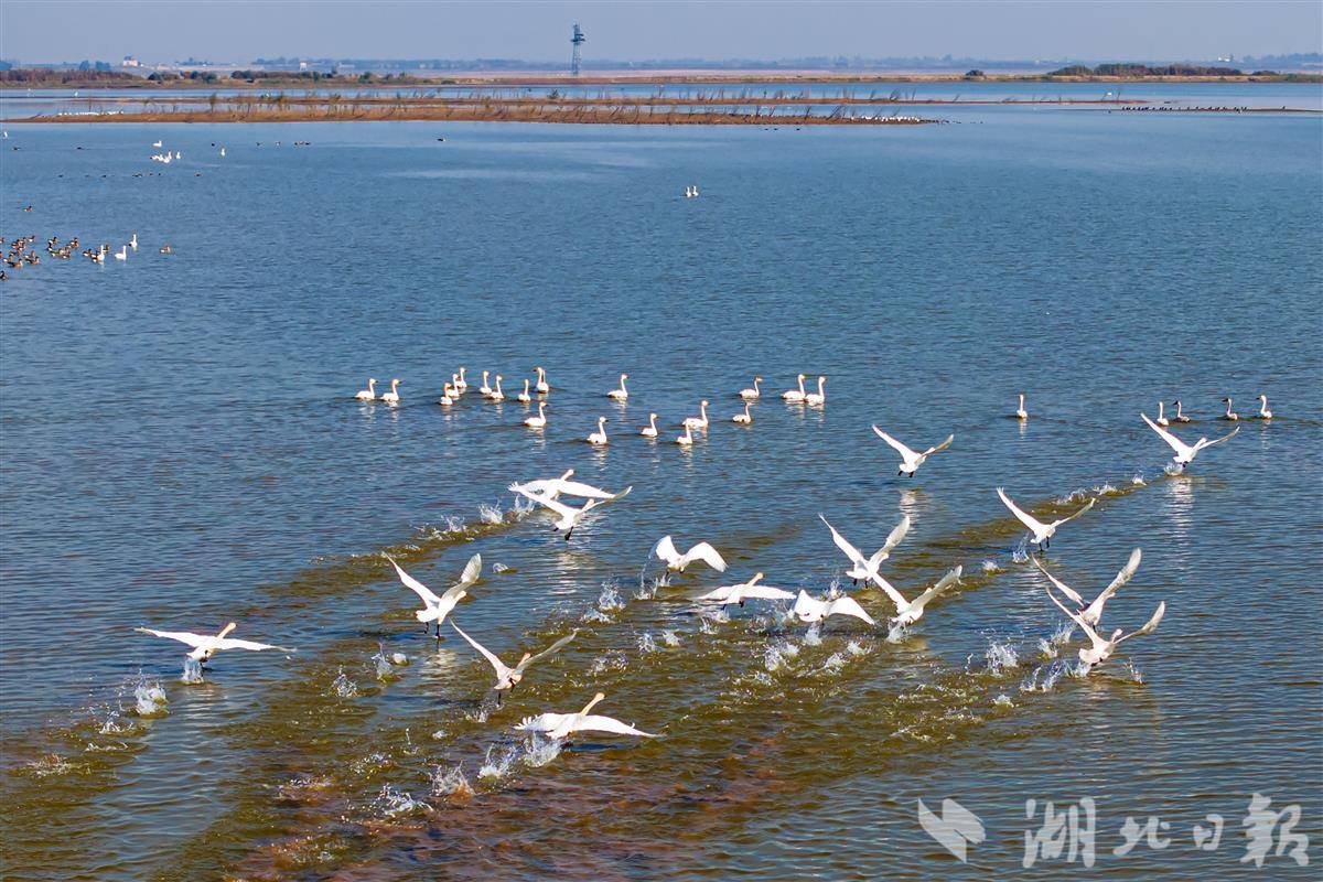 近日,在湖南岳阳君山区六门闸的洞庭湖湿地,湖水与滩涂交错铺展,水泽间处处生机盎然,洁白的天鹅浮游在波光中,成群大雁振翅飞过,漾开层层涟漪。跨越4000余公里,从遥远的西伯利亚跨山越海而来的候鸟,将洞庭湖的冬日描绘成一幅鲜活的生态画卷。(湖北日报全媒记者 任勇 摄)