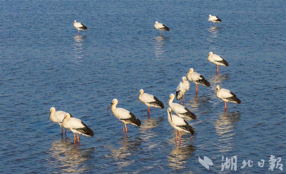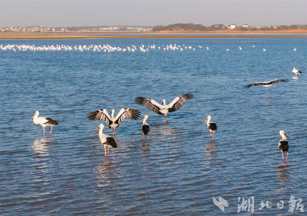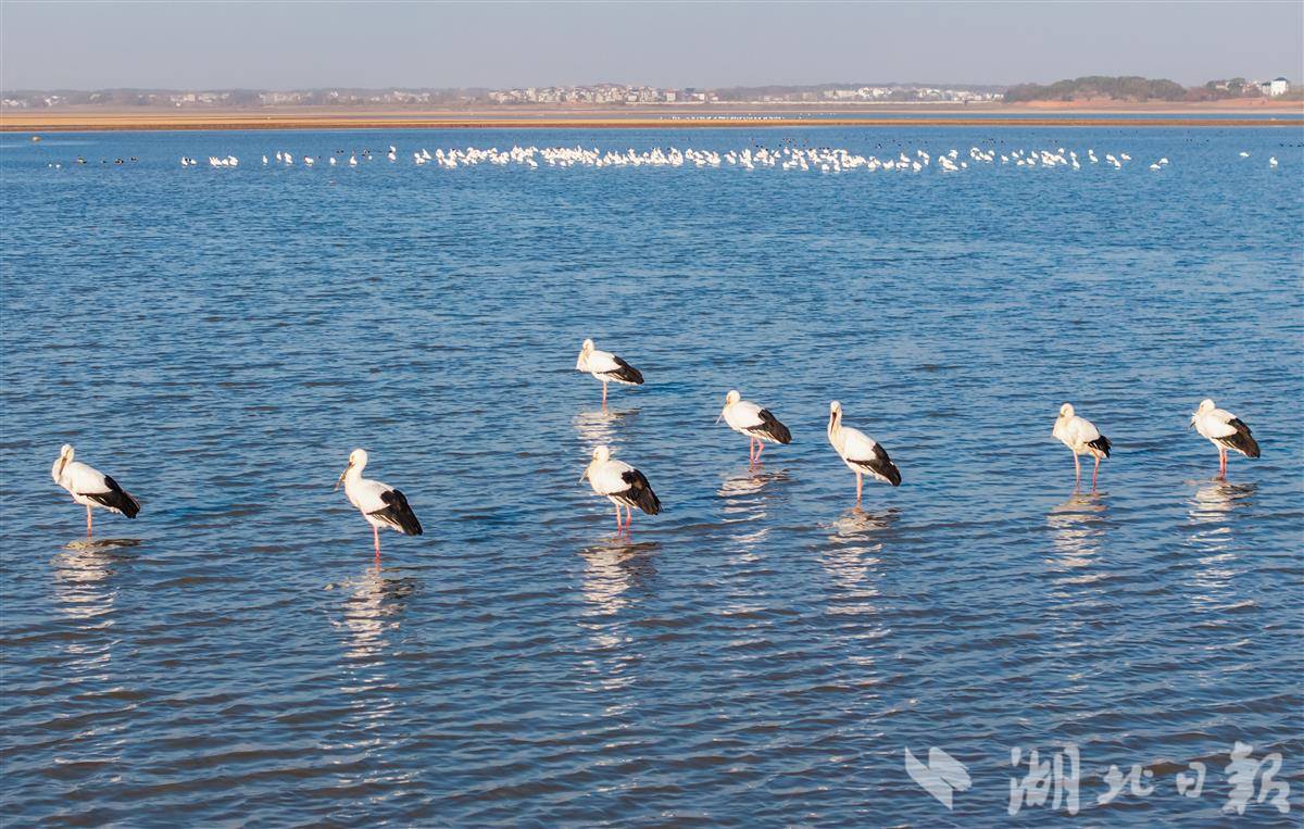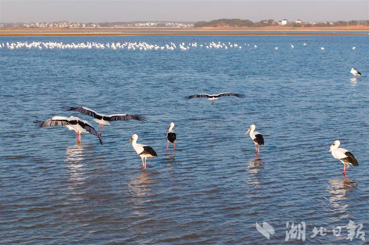 连日来,国家一级保护动物东方白鹳集中飞抵江西鄱阳湖都昌保护区,或翱翔晴空,或觅食浅滩,宛如一幅动态水墨画。(湖北日报全媒记者 薛婷 摄)