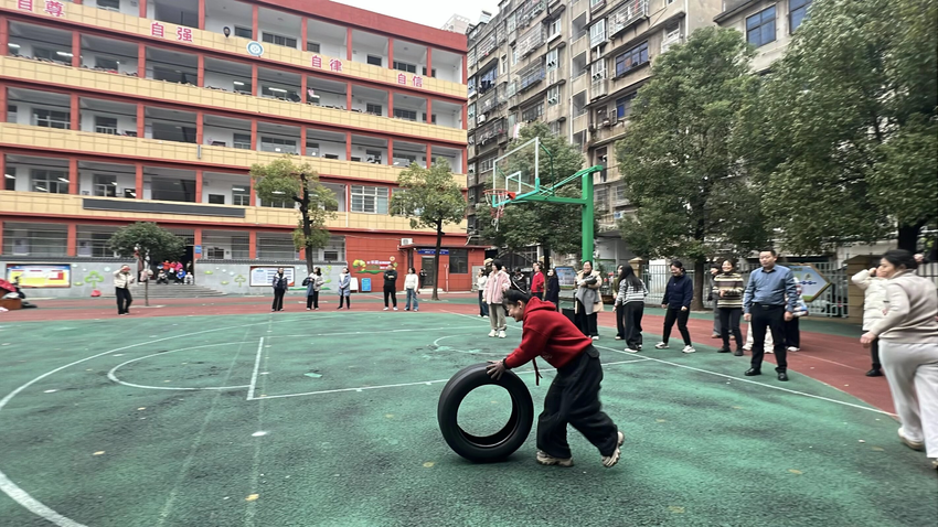 最后一个项目滚轮台比赛同样精彩十足。平日里手握粉笔、深耕讲台的老师们,此刻化身运动场上的好手,纷纷站上滚轮台。随着一声令下,大家脚踩滚轮稳步前行,有的大步流星、节奏明快,有的稳中求进、默契配合,彩色的滚轮在赛道上飞速滚动,宛如“风火轮”般灵动自如。老师们时而相互鼓劲,时而调侃打趣,滑稽又矫健的动作引得全场笑声不断,欢乐的氛围在赛场之上无限蔓延。最终,中年级组凭借出色的平衡感和协作力斩获该项目冠军。