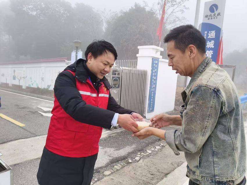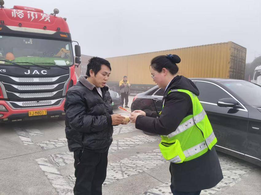 暖心服务不止于餐食保障。志愿者谭飞、朱利浪沿滞留车队逐车告知免费早餐信息,遇到欲转走国道的司乘,耐心劝解:“雾天路滑,国道能见度同样不佳,‘道路千万条,安全第一条’,待雾散后通行更稳妥!”同时,两人全力疏导通城大道路口交通,确保出口通行有序。