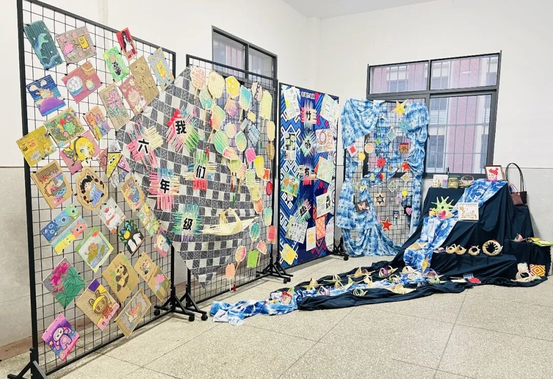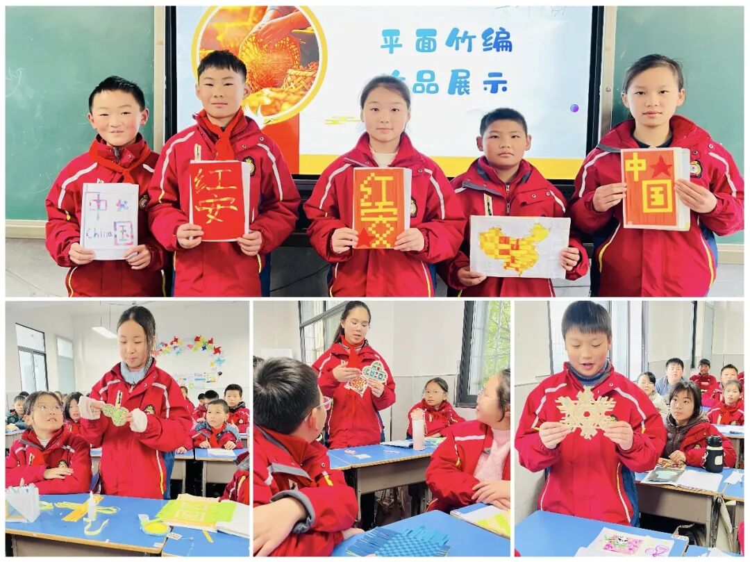 掌握基础编织技巧后,教师鼓励学生们大胆创新,融入现代审美与个人表达。展览中,有学生将数学课上学到的几何图形转化为竹编纹样,创作出极具现代感的装饰画;有学生结合环保理念,用废旧作业纸与竹篾混合编织,制作出独具特色的灯罩;还有学生小组合作,编制了红色五角星、红船、团扇等特色作品。