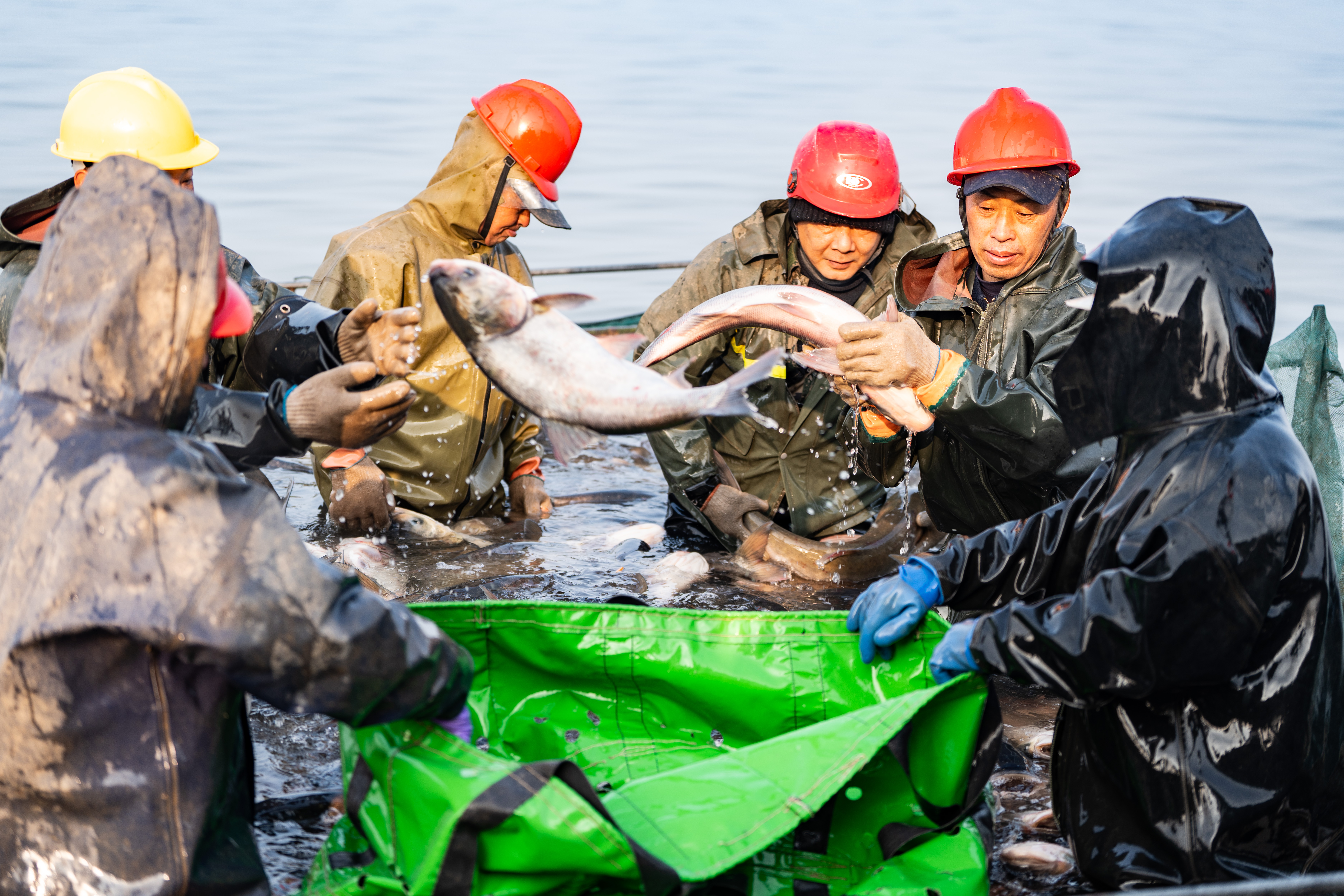 1月5日,在金湖国家湿地公园,冬季捕鱼作业正热火朝天地进行。围网内,数以万计体肥个大的生态鱼翻滚雀跃。工人们忙着将捕捞上来的鲜鱼称重、装箱。