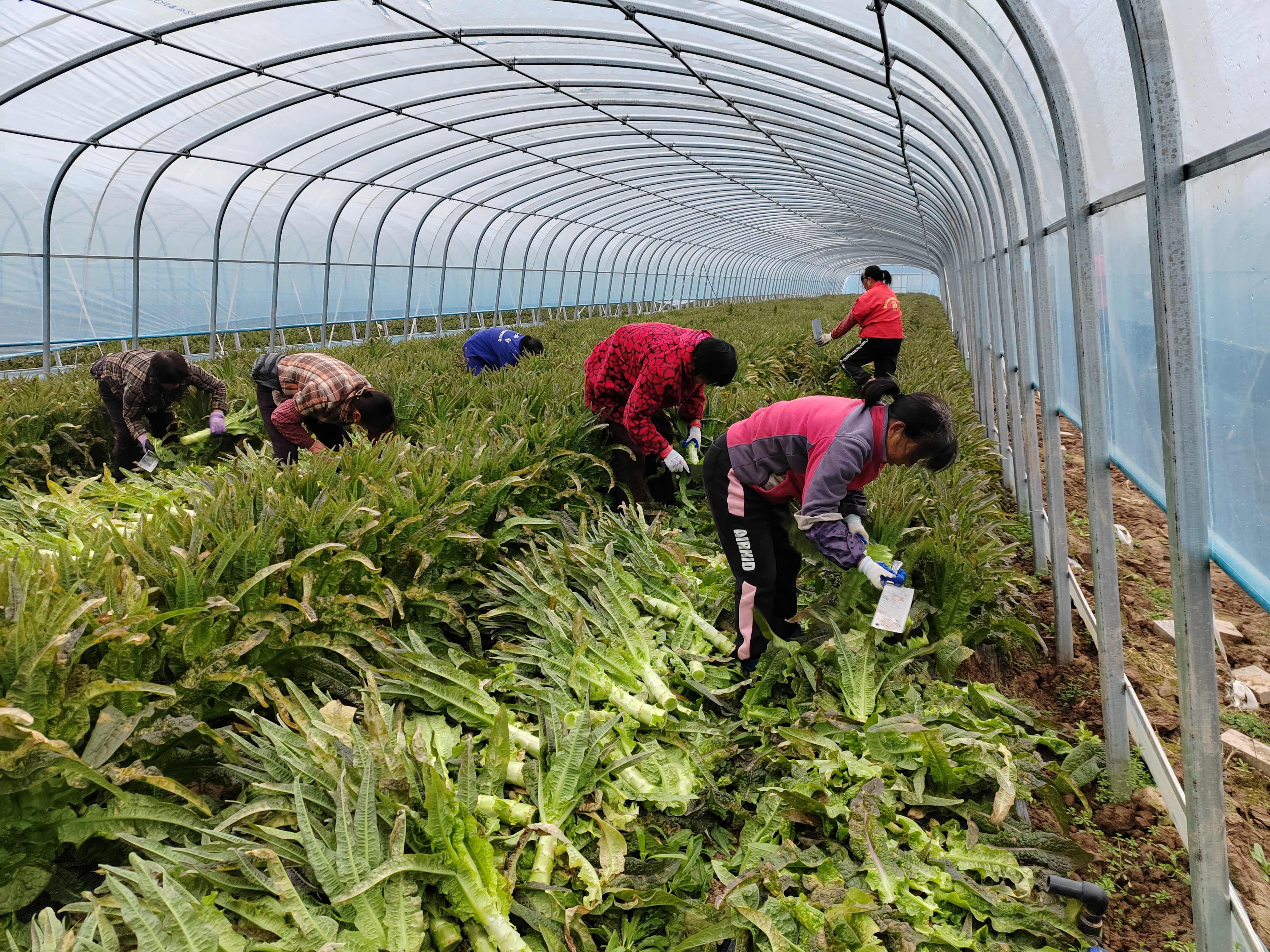 村民李敬云一边忙着手中的活计,一边高兴地说道:“今年我们采用了大棚种植技术,成功避开了几次寒潮的影响。你看这莴笋,个头均匀、色泽也好,产量和品质都比往年更稳了。”