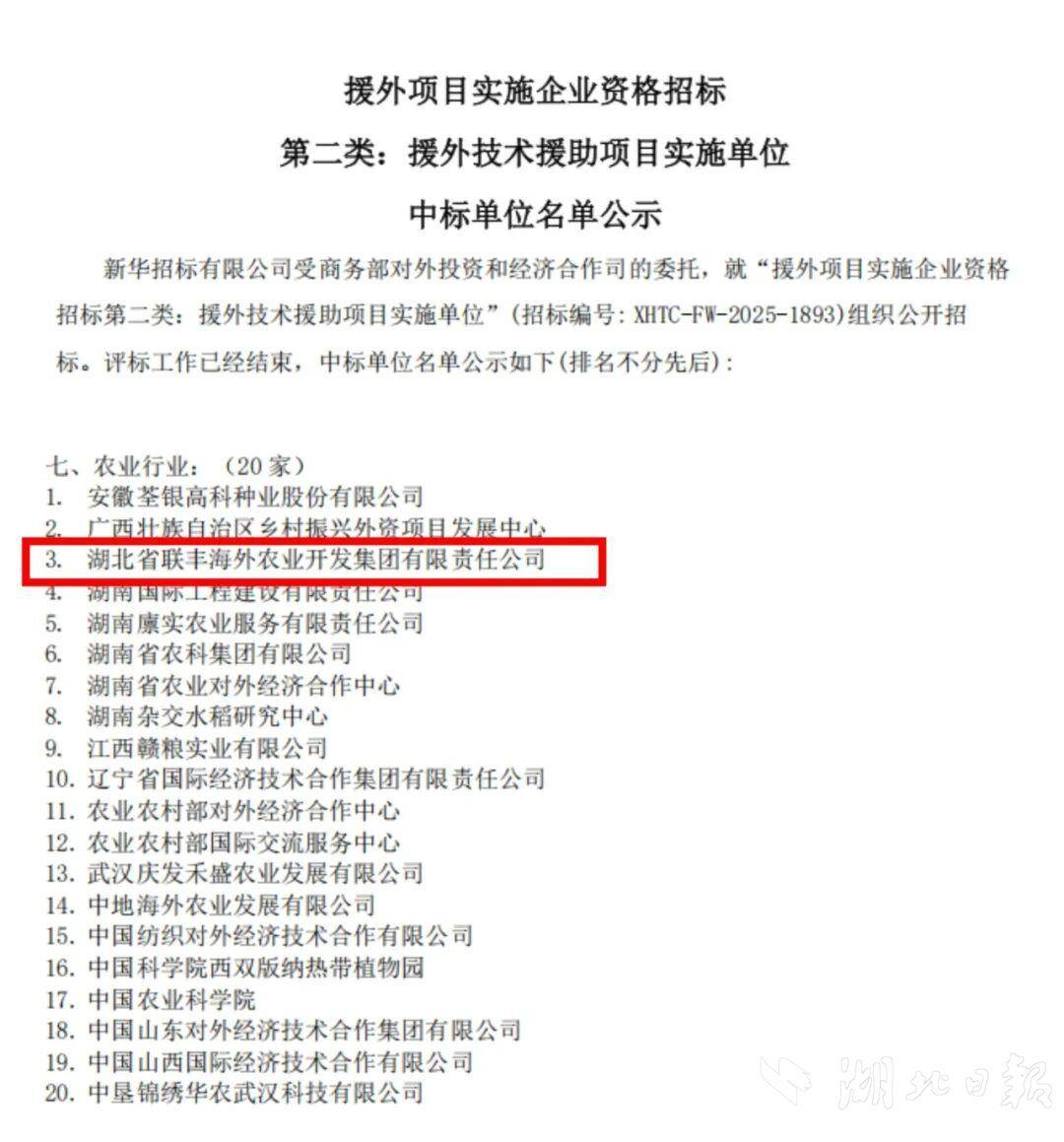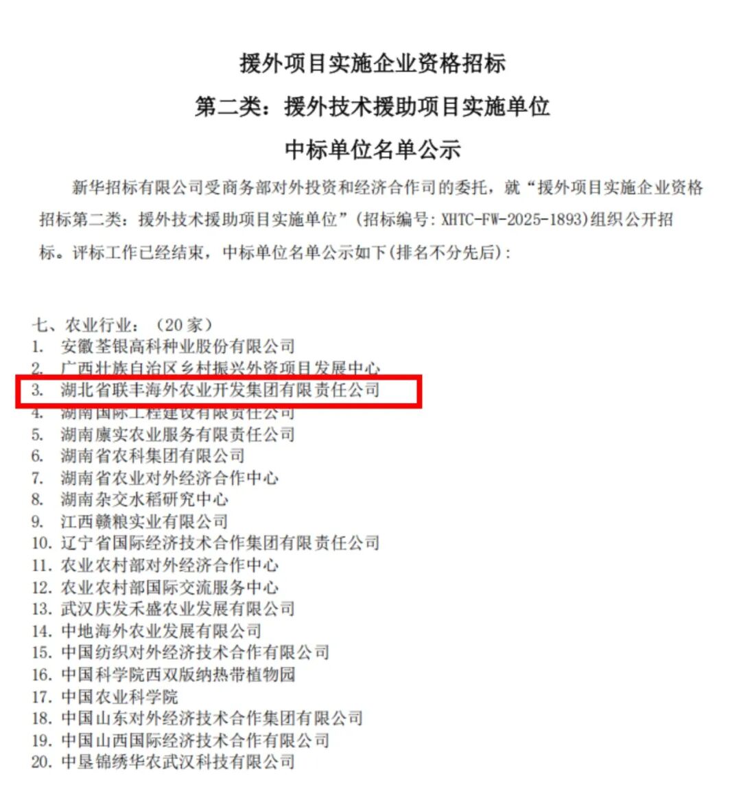 湖北日报讯(记者陈屿、通讯员李博农、姚诗悦、龙建红)近日,商务部援外项目实施企业资格招标(第二类:援外技术援助项目实施单位)结果公示。湖北农发集团旗下省粮油进出口集团联丰海外凭借卓越的项目履约能力、扎实的专业技术实力以及良好的行业口碑,再次获得援外项目实施企业资格。这一国家级资质的再次授予,既是对联丰海外多年来在援外领域工作成效的权威认证,也为企业深度赋能国际合作、服务“一带一路”建设注入强劲动力。