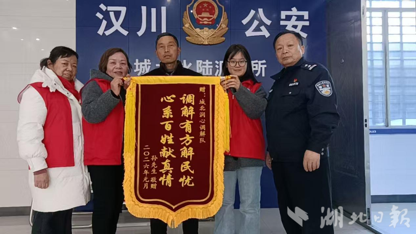 湖北日报客户端讯(通讯员董文欣、张红辉)1月6日,汉川市城北派出所“平章润心调解驿站”收到了成立以来的第十二面锦旗。锦旗上“调解矛盾化民忧 心系百姓解民愁”的话语,承载着群众对调解工作的认可。