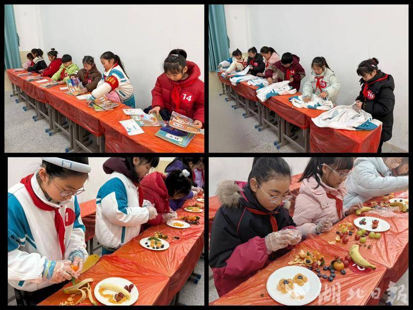 比赛结合学生年龄特点分年级设项:低年级整理书本文具,中年级叠放校服,高年级制作创意水果拼盘。比赛中,选手们动作娴熟、表现出色,作品整齐且富有巧思。评委从完成速度、操作质量、劳动态度等维度现场公开公正评分。