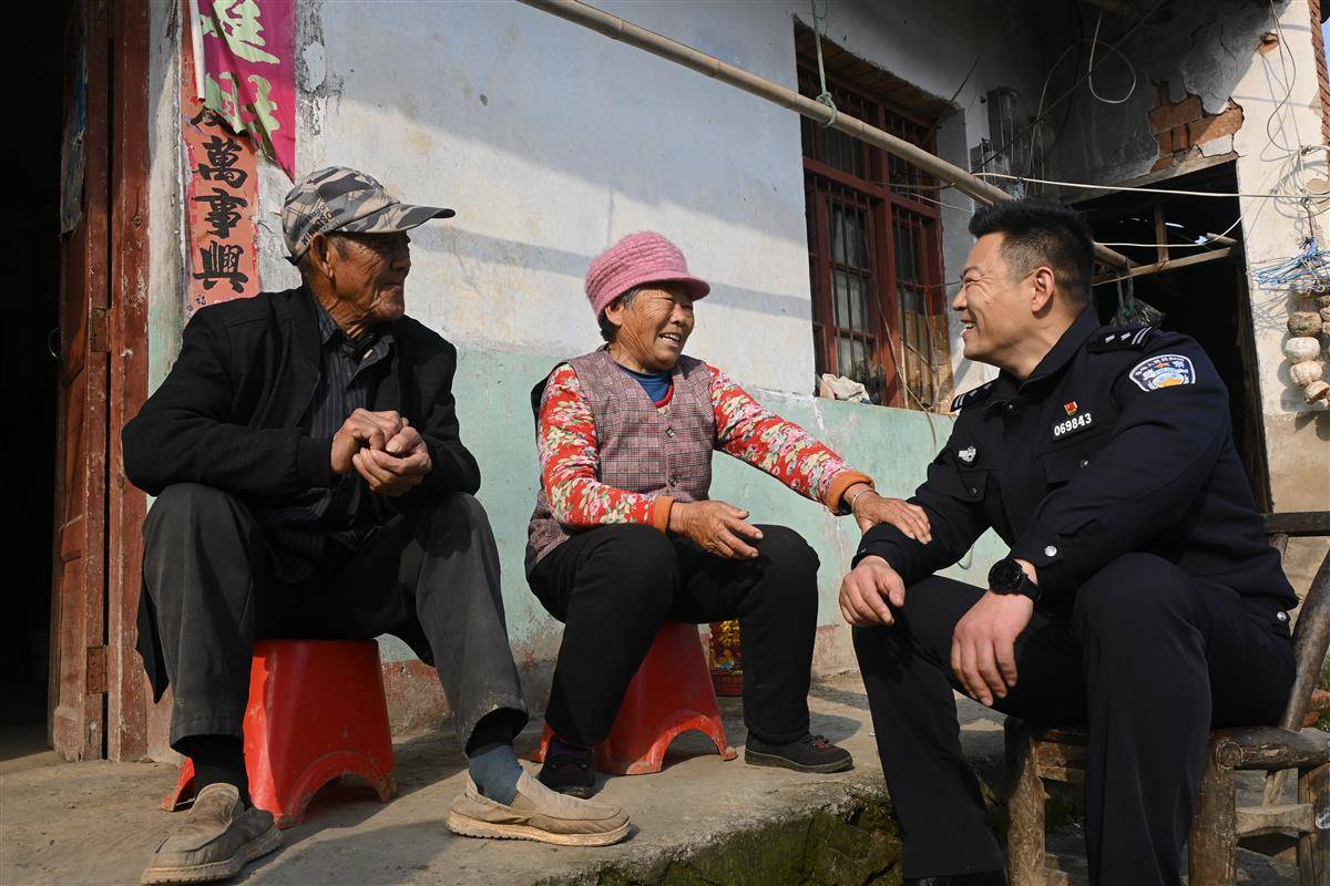 1月8日,冬阳煦暖,襄城区卧龙镇西乡村二组村民王永相家门口,襄阳市公安局襄城区分局民警孙毛永和老两口晒着太阳、聊着天,其乐融融。记者祝兆林摄