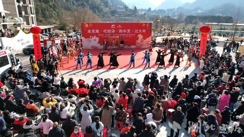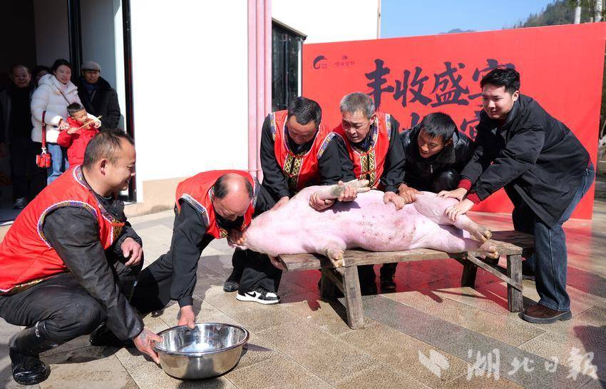 湖北日报客户端讯(通讯员谢顺)1月10日,在湖北省恩施土家族苗族自治州恩施市白果乡下村坝村,“来恩施 • 吃刨汤 • 购年货 • 过大年”民俗美食消费节启幕。村民们忙着杀年猪、烹佳肴,游客吃刨汤、看土家民俗节目、逛年货集市、选购特色农产品,沉浸式体验浓郁的土家年俗。