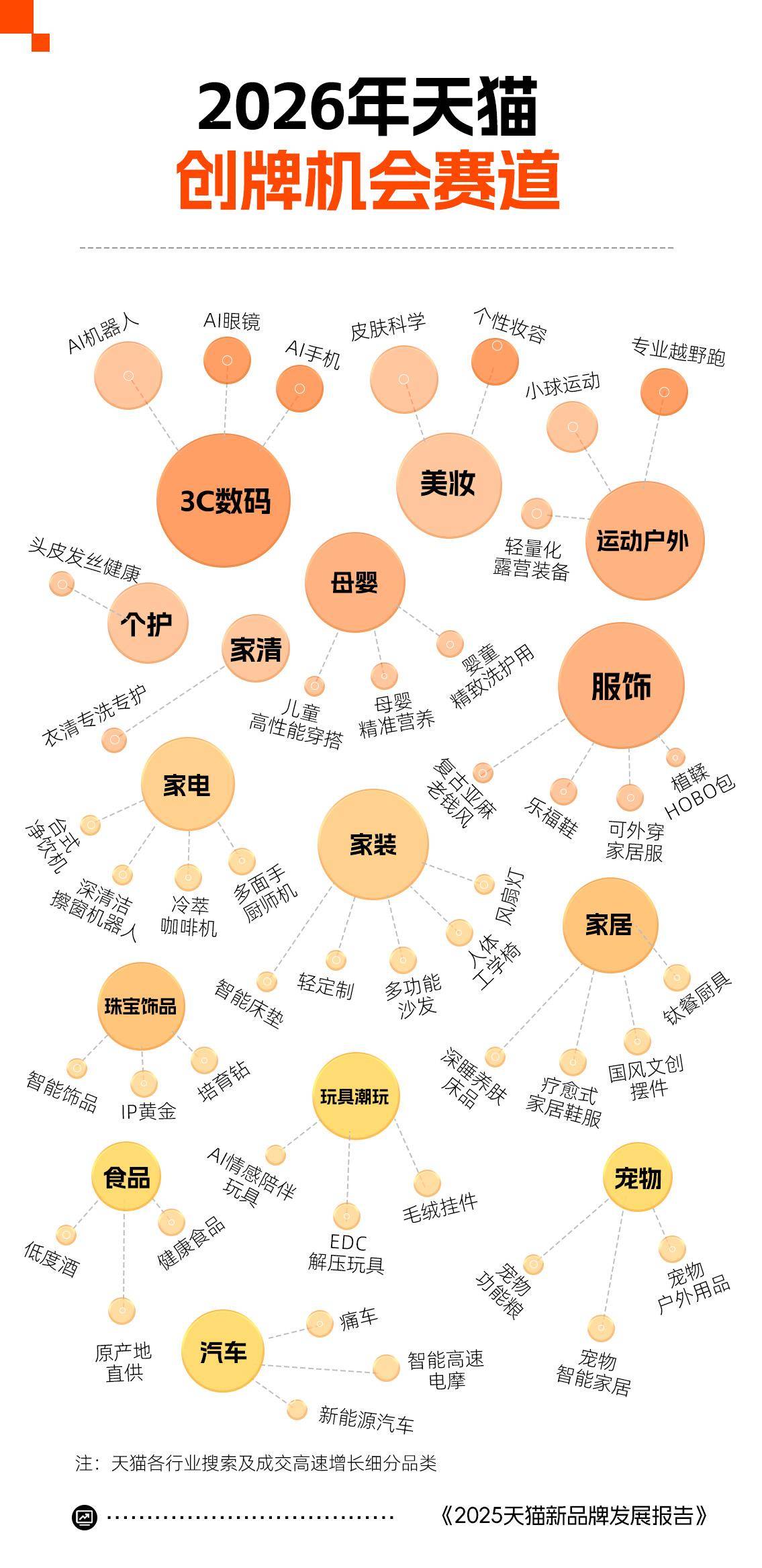 年度新品牌发展报告还同时发布了2026年50个蓝海机会赛道:智能机器人、AI眼镜、皮肤科学、个性妆容、可外穿家居服、植鞣HOBO包、家装轻定制、智能床垫、钛餐厨具、小球运动、轻量化运动装备、专业越野跑、宠物户外等,当前用户搜索及购买热度持续上升,品牌增长空间较大。