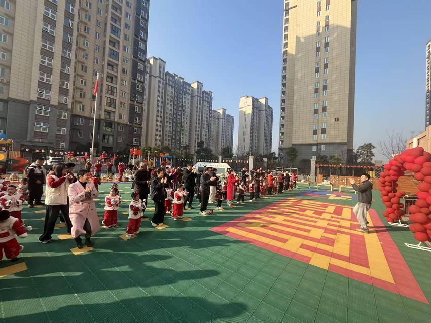 “咚咚锵”的节奏里,集体表演环节拉开帷幕:孩子们裹着红白相间的中式表演服,在气球拱门下跳出歪歪扭扭却格外整齐的舞步——有的小手挥得带风,有的圆脸蛋笑出酒窝,家长们举着手机“追拍”,快门声裹着掌声,把冬日操场焐得暖融融的。当小家伙们集体喊出“祝大家马到成功”,脆生生的童声里,藏着文明实践“培育时代新人”的温柔期许。