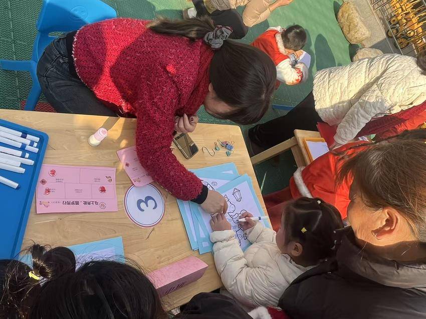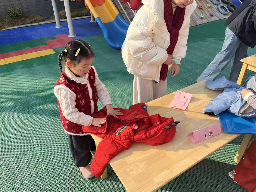 一旁的“能力挑战区”里,萌娃们忙着“大显身手”:中班小朋友叠外套时皱着小眉头却不肯求助,系书包带的动作虽笨拙却格外认真;DIY红包桌上,彩笔涂出的金元宝歪歪扭扭,却被家长小心收进衣袋;跳绳的小家伙甩着绳子蹦跳,发梢的红绒花跟着一颠一颠……这些细碎的小活动,是文明实践站“以小见大育新人”的具象实践——在玩闹中教孩子自立,在创作里传扬传统文化。