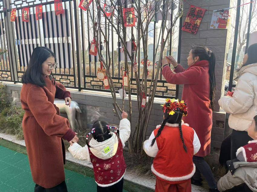 活动伊始,“心愿祈福树”下已是一片欢腾:扎着红绒花的小朋友踮起脚尖,把写着“要当小马驹跑得快”的卡片系在枝桠上,老师轻扶着他们的胳膊,红底金字的“万事如意”挂饰随风轻晃,把新年期许揉进每一缕光影里。这抹跃动的“中国红”,正是新时代文明实践站传承传统文化的生动注脚,让年味与文化基因一起扎根童心。