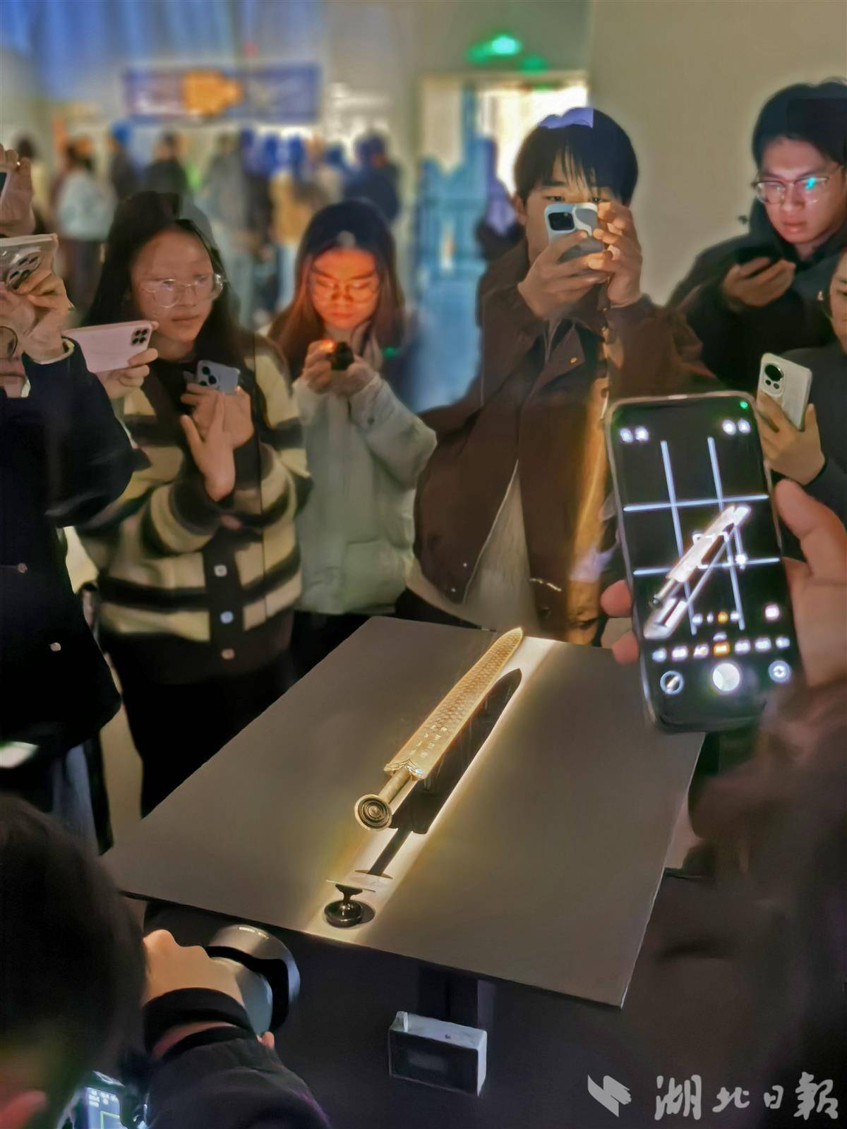 1月15日,湖北省博物馆南馆二楼越王勾践剑展厅内人头攒动,慕名而来的游客排起长队,争相一睹 “天下第一剑” 的真容。展厅里,观众们举着手机聚焦展柜,定格剑身精美菱形暗纹,以及剑格处镶嵌的蓝琉璃与绿松石。这柄春秋晚期青铜剑,1965年出土于湖北江陵望山楚墓,历经两千余年岁月洗礼,依旧寒光凛凛、锋利如初,可轻松划破 20 余层纸张。剑身上 “越王鸠浅自作用剑” 的鸟篆铭文,搭配巧夺天工的铸造工艺,引得现场游客连连惊叹。当下,全国范围内的文博热潮持续升温,逛博物馆、亲近文物已成为大众追捧的生活方式与文化新风尚。(湖北日报全媒记者 刘曙松 摄)