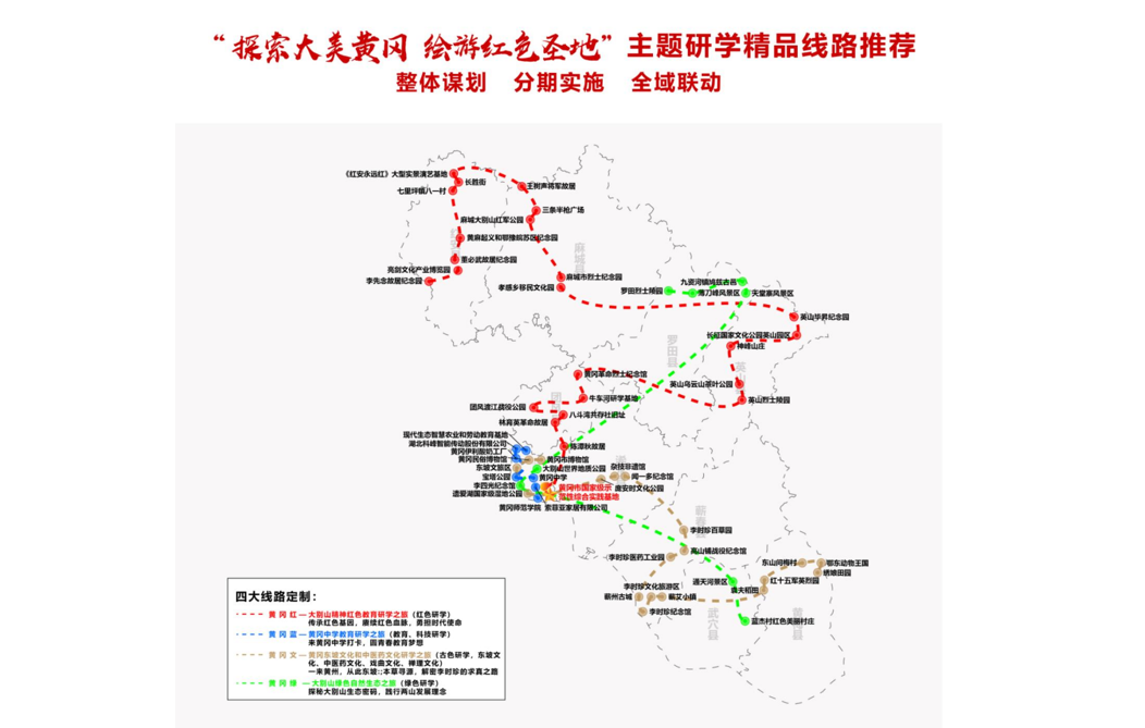 在市教育局支持下,教育集团围绕“弘扬大别山精神”这一核心,创新建立了“六个一”的红色标准化课程体系:祭拜一次革命先烈、听一堂红色大思政课、看一场红色演出、学唱一首红歌、体验一次革命生活、写一封红色家书,让红色基因代代相传。围绕研学基地营地建设,构建起“1+9+N”研学矩阵(即1个市级营地、9个县级营地和全市96个基地),开发出弘扬大别山精神红色教育研学、黄冈中学教育研学、东坡文化和中医药文化研学、大别山绿色生态研学四个系列研学精品线路,将红色教育、教育研学、文化体验、生态探索融为一体,建立起完整的研学旅行课程体系和标准体系。