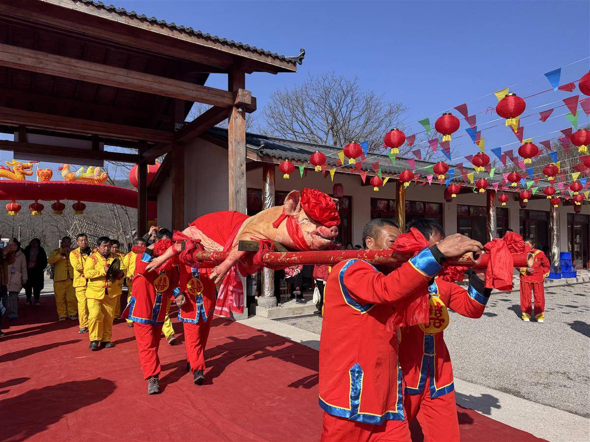 活动当日还举办了保康县传统民俗——杀年猪。图为村民肩扛年猪入场。(湖北日报全媒记者 周升蕾 摄)