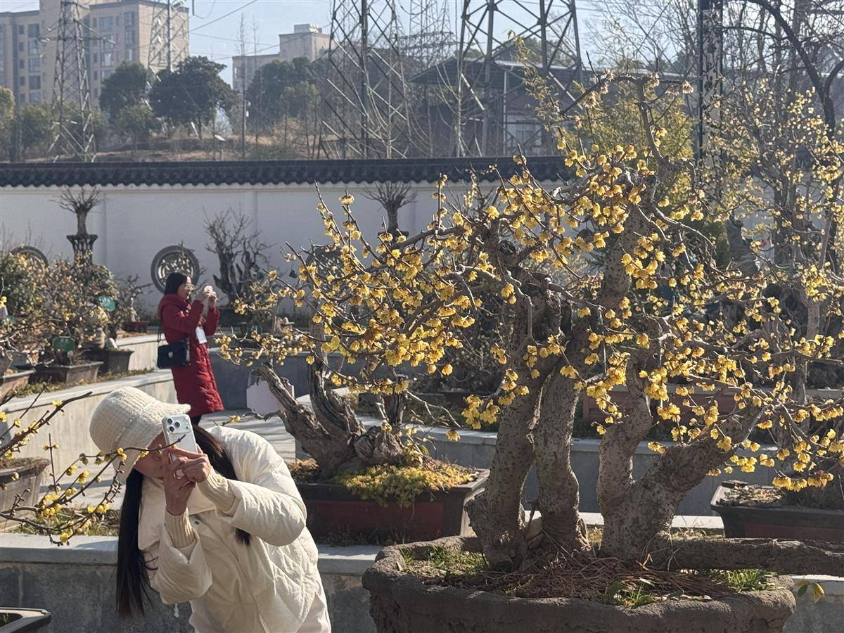 保康县蜡梅公园内,游客在观赏蜡梅花。(湖北日报全媒记者 周升蕾 摄)