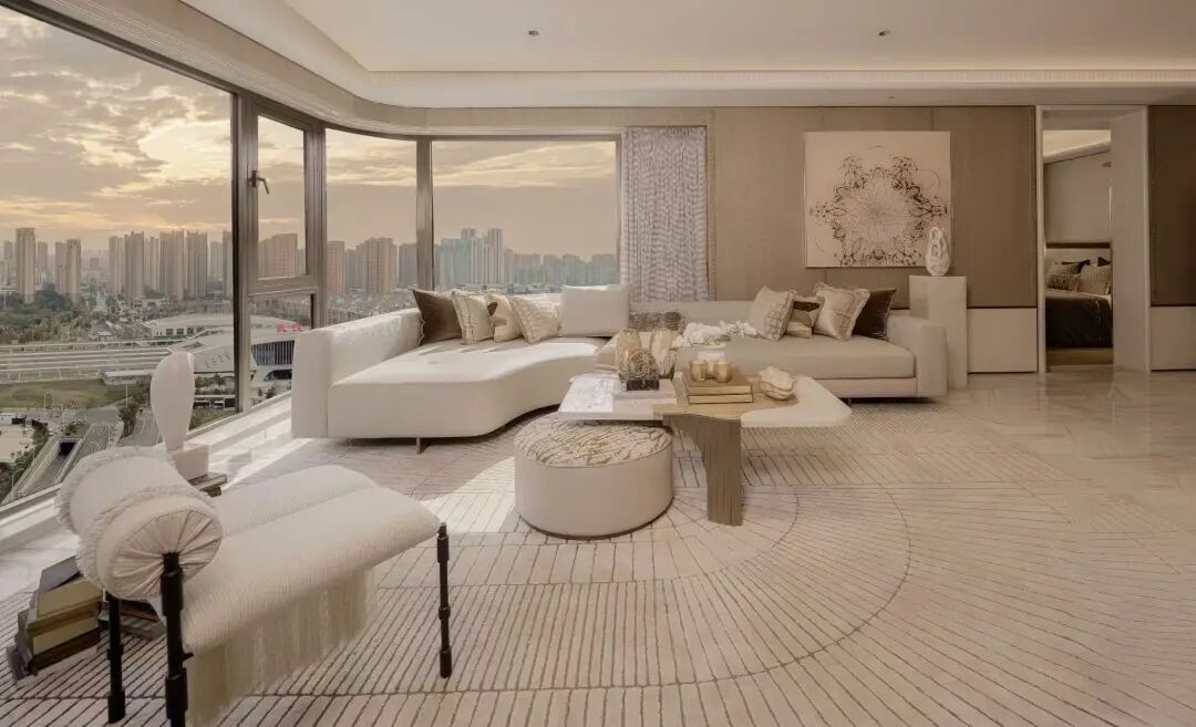 招商原颂建筑面积约155平方米的户型样板间,窗外可见武汉东站