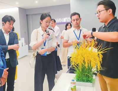 在武汉产业创新发展研究院,中外嘉宾了解“稻米造血”技术。