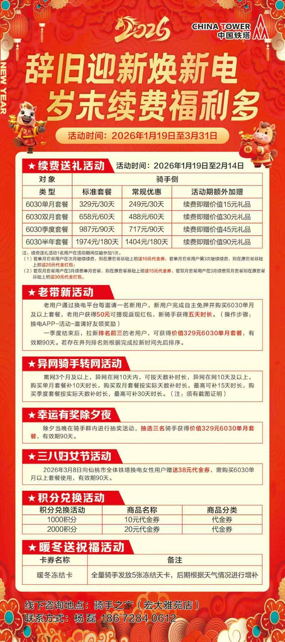 为抢抓岁末营销节点,1月19日,江汉铁塔联合渠道伙伴在骑手之家开展换电专项营销活动,同步上线两大福利:续费送礼(1月19日至2月14日)与冬日送暖(1月19日至1月23日),双重好礼强势吸客,掀起套餐办理热潮。