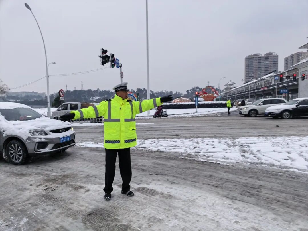 在冷家湾路口,执勤警察张艳铎正在指挥交通。“越是天气不好,路口执勤越是重要。”他家住碧桂园,早上6点多起床打车过来,7点半前到岗,看到路口行人通行不便时,上前扶一把,遇到打滑的车辆,他立即帮忙推车。