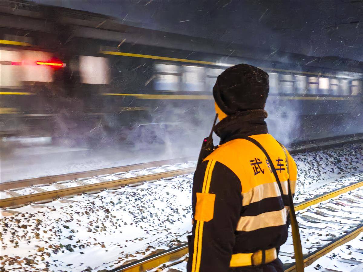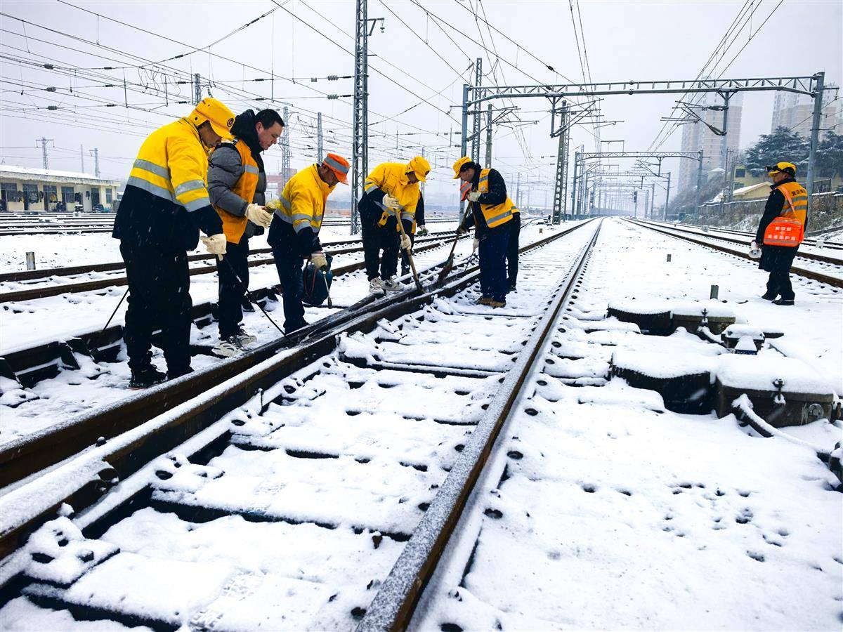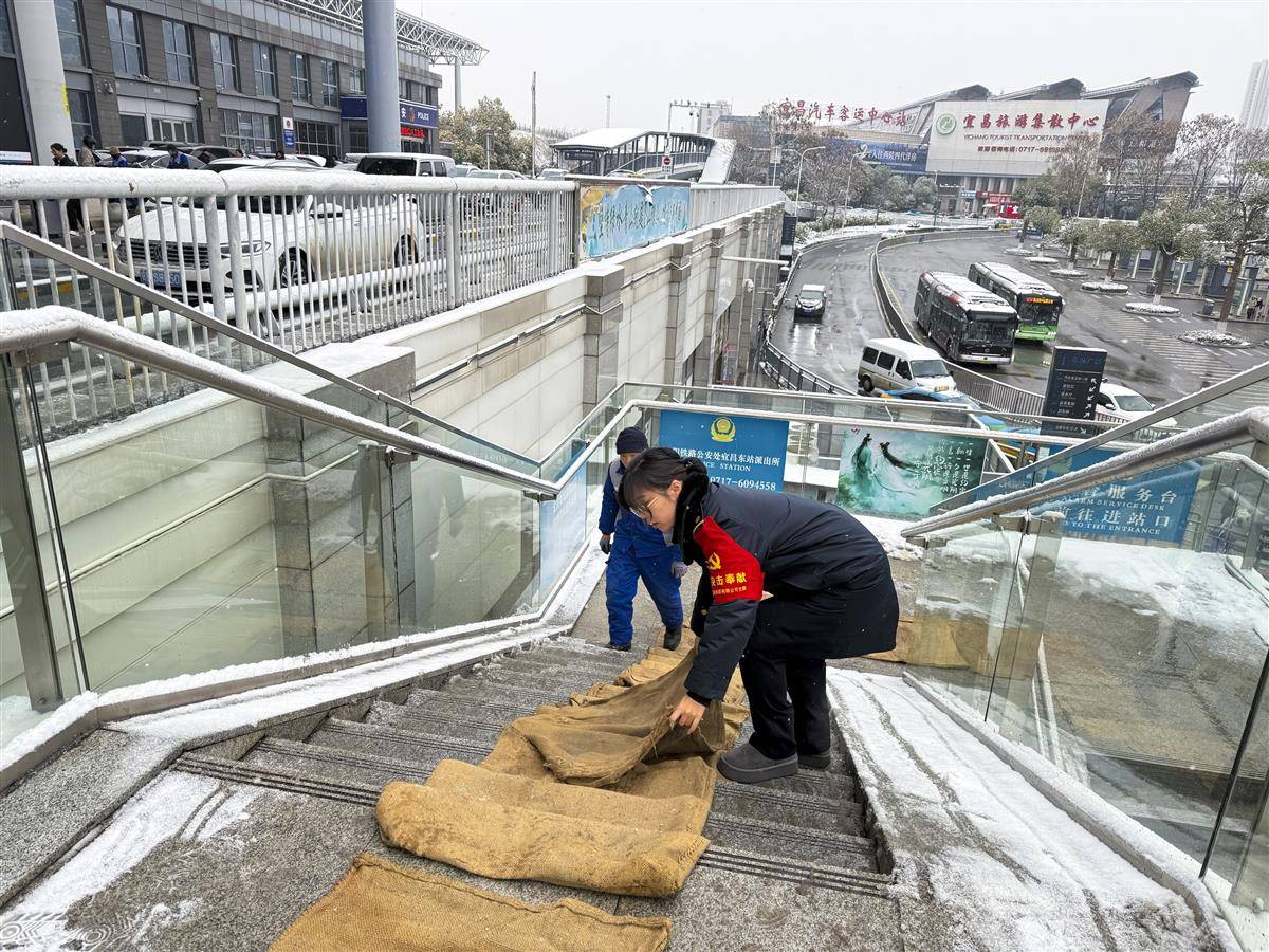 焦柳、鸦宜普速线各车站使用防冻液、喷灯、冰铲等设备对道岔关键部位不间断铲冰除雪。武宜、襄荆、荆荆高铁新线密集组织人力物力在站台、进出站口、电扶梯等关键点位铺撒工业盐等融雪剂,铺垫地毯,安排专人24小时巡查空调、热饮、即热宝等用水供暖设备。