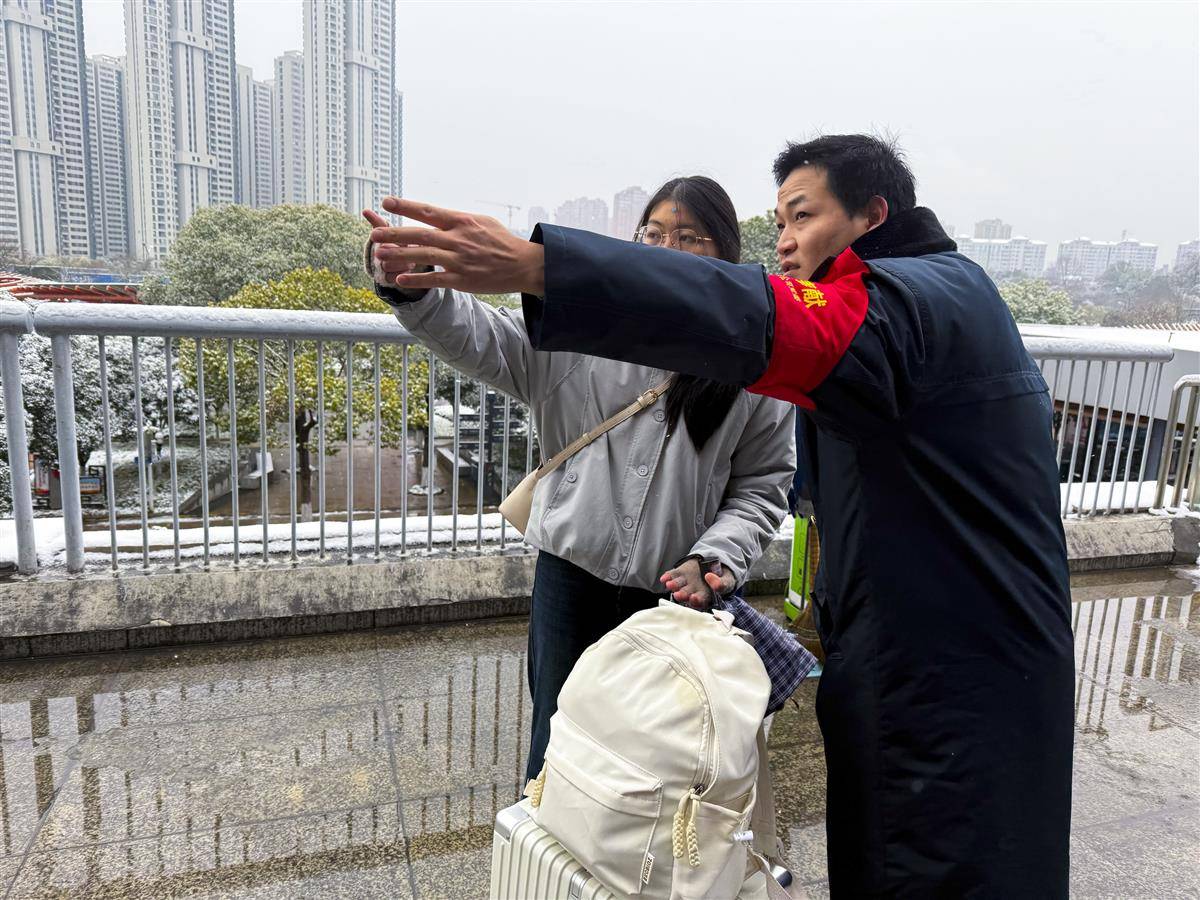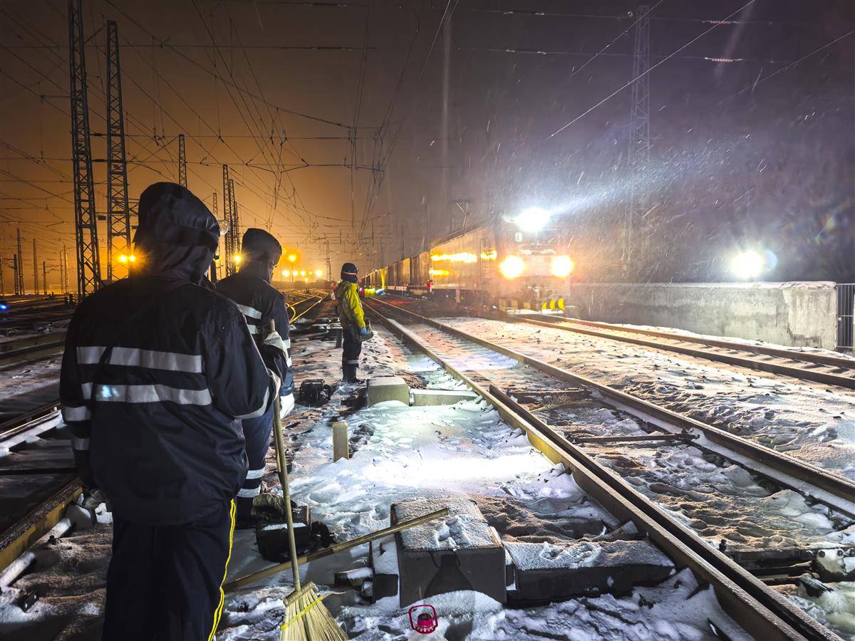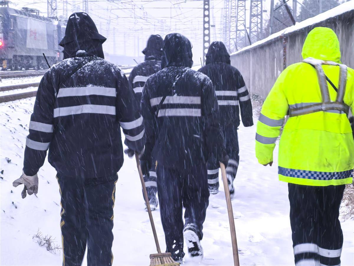 焦柳、鸦宜普速线各车站使用防冻液、喷灯、冰铲等设备对道岔关键部位不间断铲冰除雪。武宜、襄荆、荆荆高铁新线密集组织人力物力在站台、进出站口、电扶梯等关键点位铺撒工业盐等融雪剂,铺垫地毯,安排专人24小时巡查空调、热饮、即热宝等用水供暖设备。