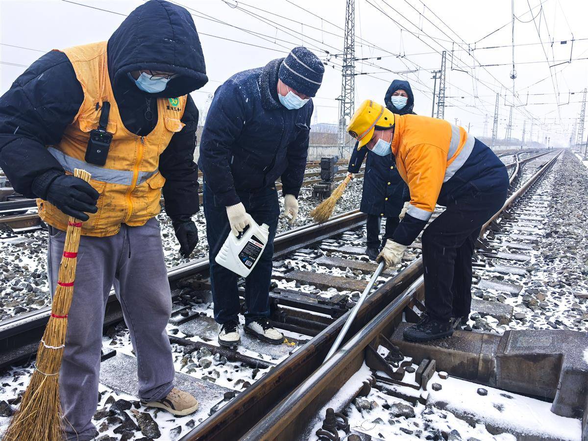 工人对道岔关键部位铲冰除雪,涂抹防冻液