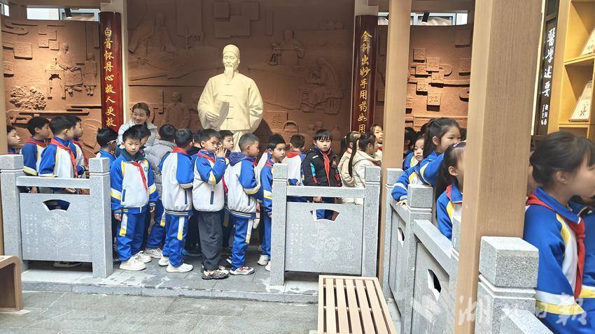 在中医名人雕塑区,孩子们围在武穴名医杨际泰的雕像前,问题一个接一个:“这个爷爷为什么留这么长的胡子?”“他写的书是不是比我们的课本还厚?”讲解员讲述杨际泰生平事迹时,还有孩子俏皮地问道:“那他会治‘不想写作业’的病吗?”