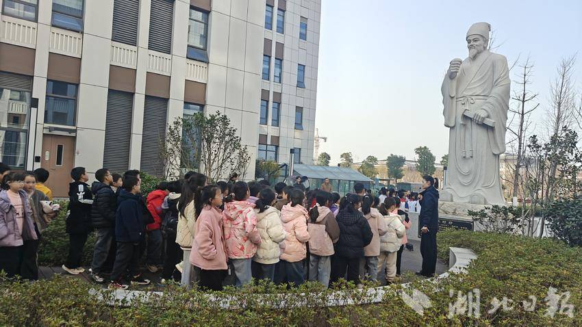 走进李时珍广场,孩子们被高大的李时珍雕像所吸引。讲解员向大家介绍:“李时珍爷爷走遍千山万水,写下《本草纲目》,记录了大量草药知识,我们现在用的很多中药方子都源于他的研究。”孩子们仰头聆听,眼神里写满了敬佩与好奇。