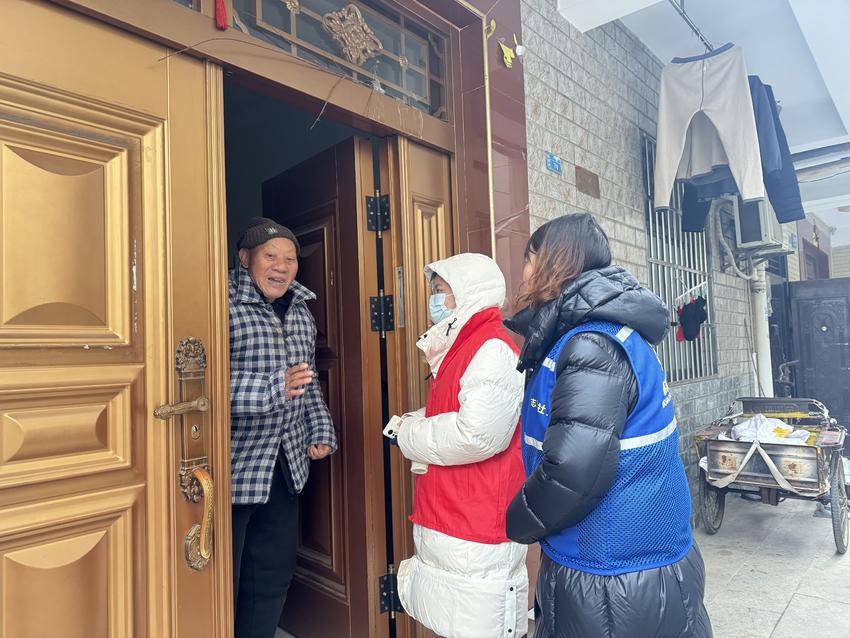 风雪无阻,关怀直达。走访队伍身着红马甲,顶着凛冽寒风,深一脚浅一脚地穿梭在被积雪覆盖的小区楼道中。每到一户,工作人员都第一时间为老人检查家中供暖设备、水电燃气安全,仔细查看门窗密封情况,提醒老人雪天地面湿滑,切勿随意出门,如需采购物资、就医等需求,可随时联系社区寻求帮助。