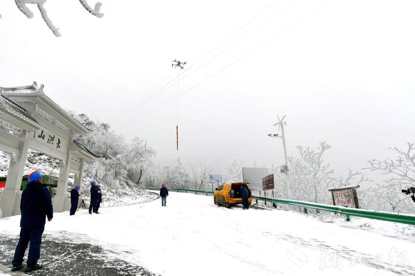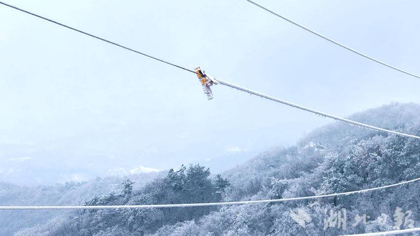 湖北日报讯(通讯员 吴绪章、包翼羽)1月20日,在随州大洪山的山谷中,随着一阵由远及近的嗡鸣声,一架无人机挂载除冰棒凌空而起,瞄准覆冰线路精准“挥剑”,撞击瞬间冰屑四溅——这不是武侠片中的特效,而是国网随州供电公司运用无人机“御剑”除冰的真实场景。