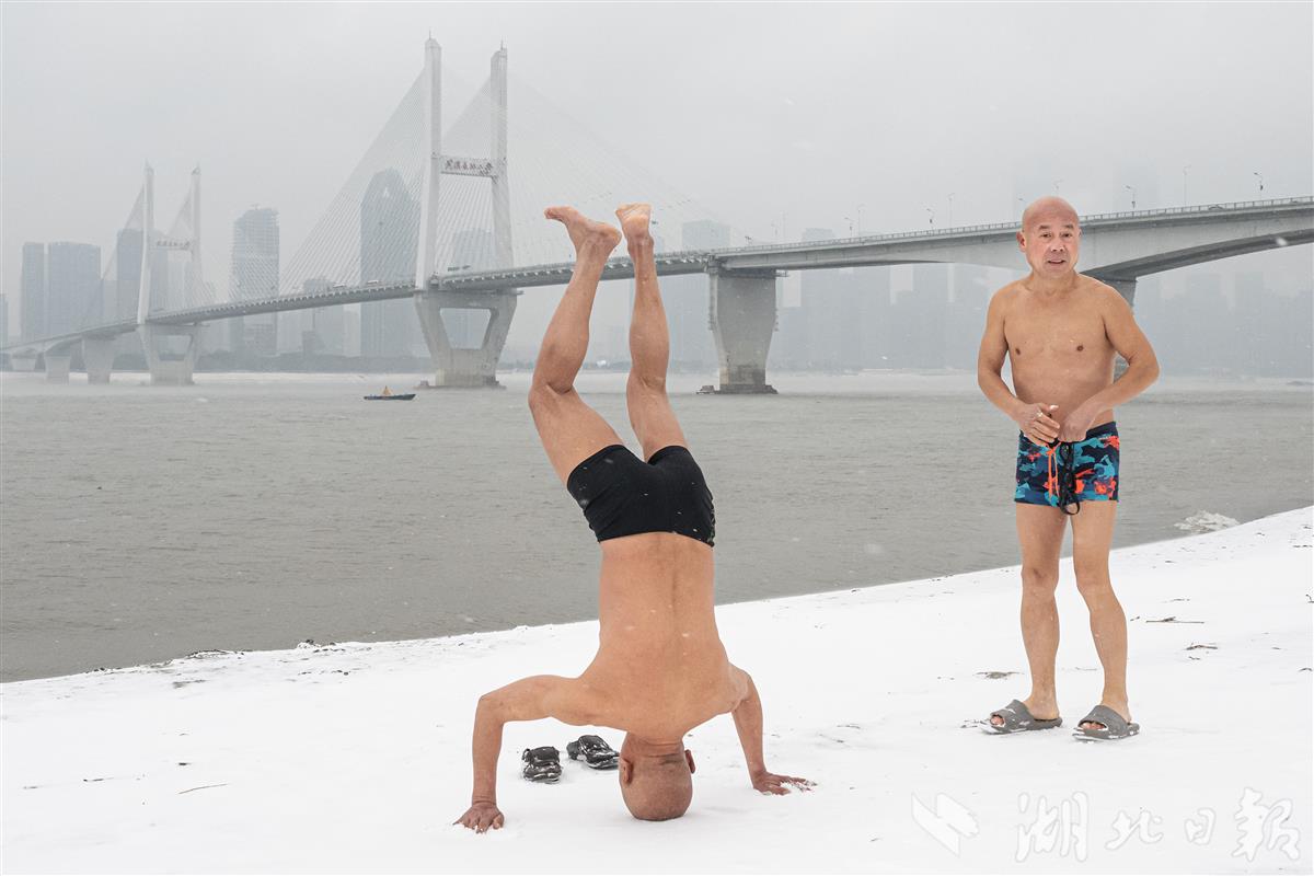 1月20日,在武汉长江二桥汉口江边,66岁的武汉大爷李念一和几名冬泳队员赤膊上阵,在纷飞的雪花中过把冬泳的瘾。19日夜间至20日,武汉迎来2026年首场降雪,经历一夜降雪的武汉,已是一片银装素裹。(湖北日报全媒记者 任勇 摄)