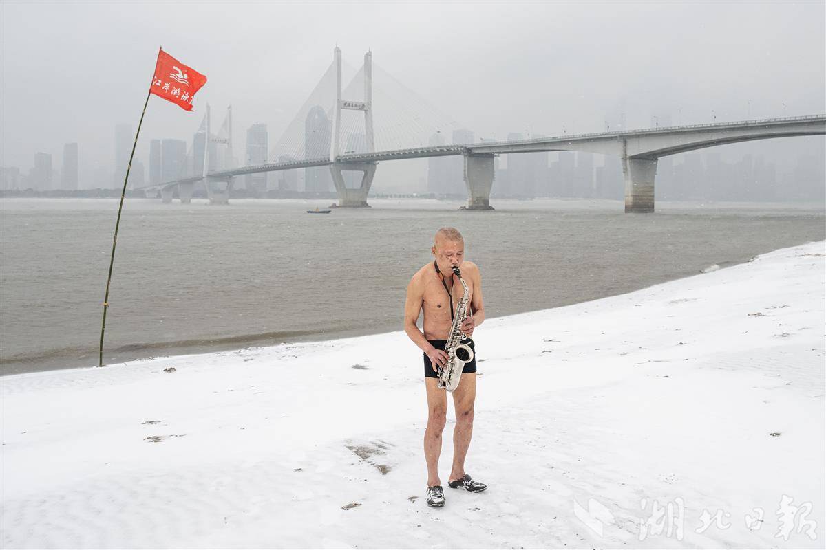1月20日,在武汉长江二桥汉口江边,66岁的武汉大爷李念一在雪地上吹奏萨克斯。(湖北日报全媒记者 任勇 摄)