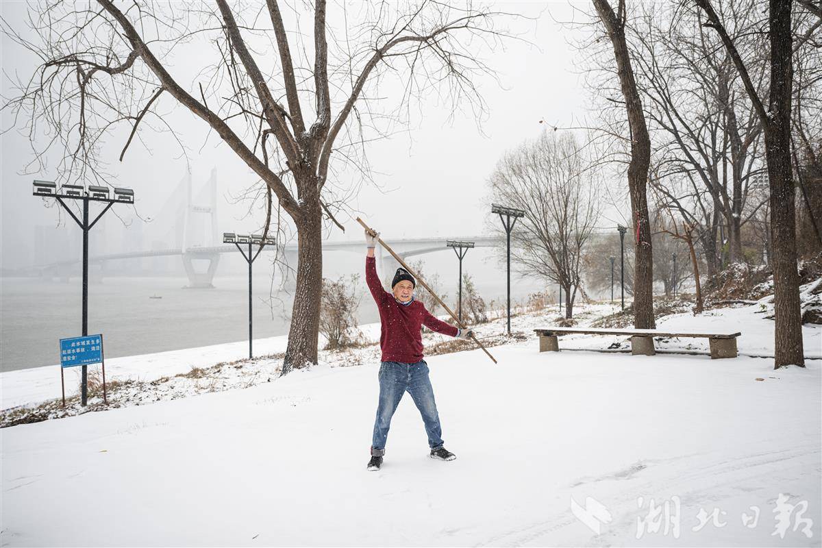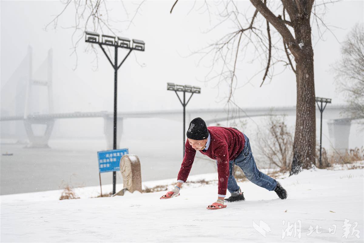 1月20日,在武汉长江二桥汉口江边,66岁的武汉大爷李念一在雪地上热身。(湖北日报全媒记者 任勇 摄)