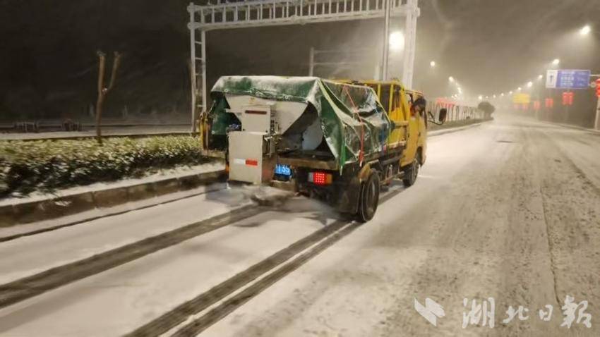 当日22时,新洲区迎来雨夹雪天气,气温快速下降,问津大桥、G318举水河桥率先出现结冰情况。第一轮除冰融雪作业随即全面展开,现场投入1台大型撒布机、2台中型撒布机、2台小型撒布机,对桥梁车道精准撒布融雪剂。