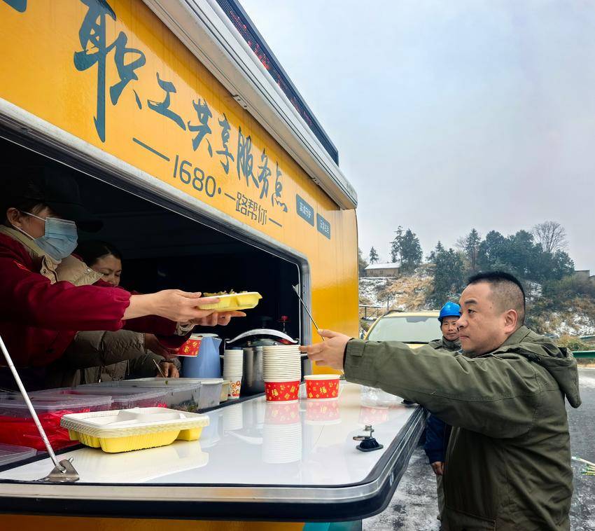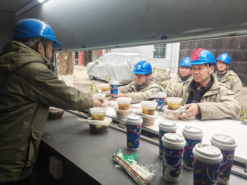 为确保抢修任务的顺利完成,国网通城县供电公司应用国网湖北省电力有限公司移动式作业现场后勤保障车,为抗冰抢险一线员工送去热菜热饭、驱寒姜汤。
