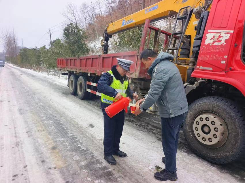 在全力保畅通的同时,随州公安交管部门还聚焦滞留司机急难愁盼,开展暖心服务。对陷入雪窝、侧滑、抛锚的车辆,民警第一时间上前救援;针对滞留驾驶人,不仅提供热水、食物等物资帮扶,还耐心安抚驾驶人情绪。民警在各管控路段逐车叮嘱司机检查刹车、轮胎防滑链等关键部件,讲解冰雪天气安全驾驶技巧,提醒切勿疲劳驾驶、超速行驶,用一声声叮嘱驱散冬日寒意。民警的暖心举动赢得了现场司机们的一致感谢,纷纷表示:“这么冷的天,警察同志不仅保障了安全,还给我们送热水和食物,真的太感动了!”