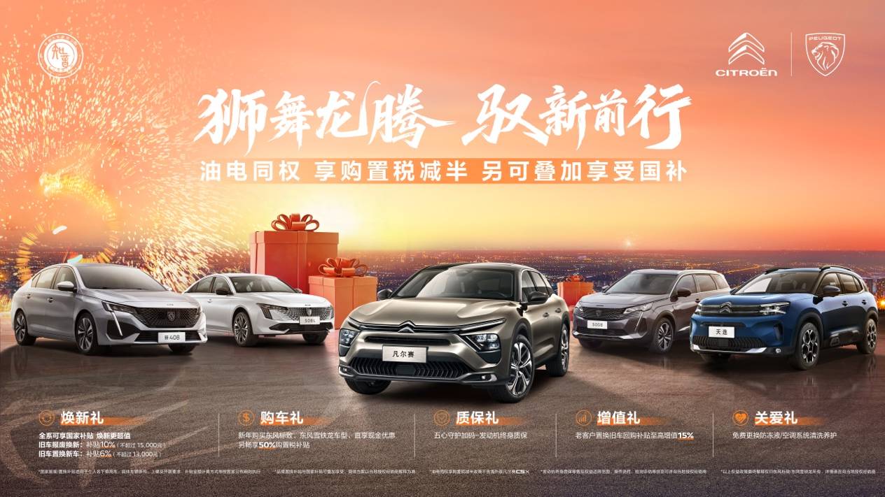在延续冬季暖心服务行动的同时,神龙汽车也为购车用户准备了“油电同权 享购置税减半 另可叠加享受国补”政策及一系列新春购车礼遇,以切实优惠响应市场需求,助力消费者新年换新车。本次推出的购车权益涵盖多方面,有焕新礼:全系可享国家补贴 焕新更超值,旧车报废换新:补贴10%(不超过15000元),旧车置换新车:补贴6%(不超过13000元);购车礼:新年购买东风标致、东风雪铁龙全系车型,直享现金优惠及另畅享50%购置税补贴;质保礼:五星守护加码—发动机终身质保承诺;增值礼:老客户置换旧车回购补贴至高增值15%;关爱礼:免费更换防冻液/空调系统清洗养护。