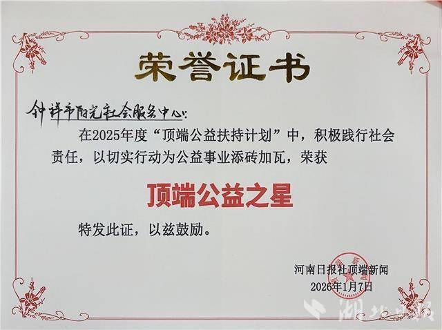 湖北日报客户端讯(通讯员张梦雅)近日,从河南日报社顶端新闻传来喜讯,钟祥市阳光社会工作服务中心凭借在2025年度公益传播领域的突出表现,入选年度“顶端公益扶持计划”,斩获“顶端公益之星”荣誉称号,系荆门地区唯一获此殊荣的县域公益组织。