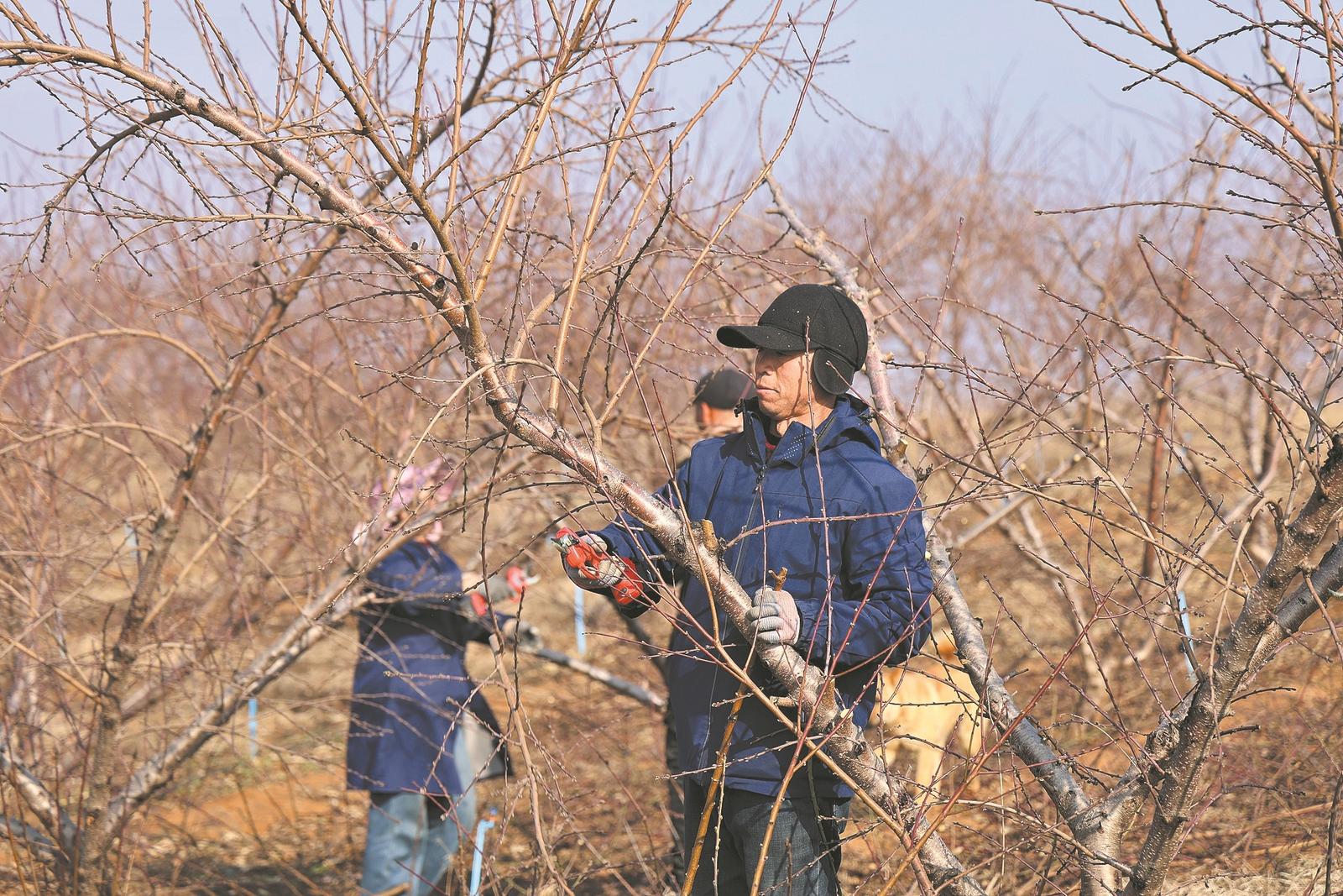 近日,记者在流水镇黄岗村的果园看到,果农们正在熟练地修剪果树枝条。(来源:襄阳日报