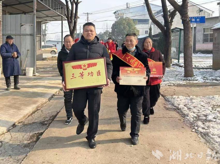 湖北日报客户端讯(通讯员谢素素)1月22日,南河乡天鹅村和同兴村洋溢着喜庆气氛。汉川市退役军人服务中心联合南河乡退役军人服务站,组成送喜报队伍,为荣立三等功的现役军人周昌旭家庭和连续两年立功的龚昌盛家庭,送去了喜报、慰问金及“功臣之家”牌匾。