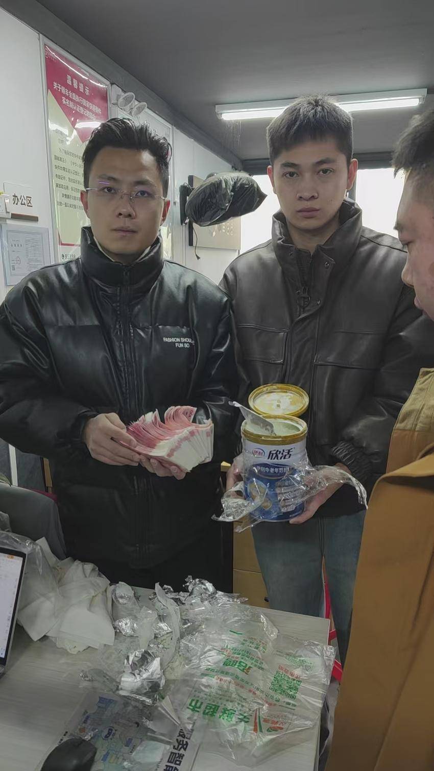1月22日14时20分,武汉市公安局汉阳区分局反诈中心接到市局反诈中心紧急指令:有一个寄往汉水琴台小区的快递包裹,可能涉嫌电信网络诈骗案件。接到指令后,分局刑侦大队反诈中队、五里墩街派出所迅速行动,15分钟内赶到快递站点,将正在派送的包裹紧急拦下。民警依法开箱查验,发现嫌疑包裹内是一罐奶粉。奶粉罐封得十分严实,且异常沉重,摇晃时并不像装有奶粉,遂立即开封检查,发现罐内装有4捆层层包裹的圆筒,再以少数奶粉填充罐体,拆开后竟是一捆捆现金,经清点共计4万元现金。