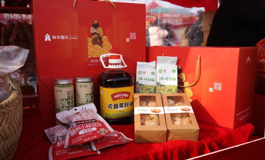 “今天生意特别火爆,香肠、腊肉等一摆出来就有很多人来问价。”湖北鲜选农业发展有限公司销售员吴纯介绍,她手中的香肠原价40元一斤,叠加消费券优惠后到手价格约为七折,吸引不少顾客排队选购。而备受关注的“炎帝赐福 幸福生活 You and Me”米油礼盒,也因其承载“五谷丰登”的美好寓意,成为走亲访友的热门选择。