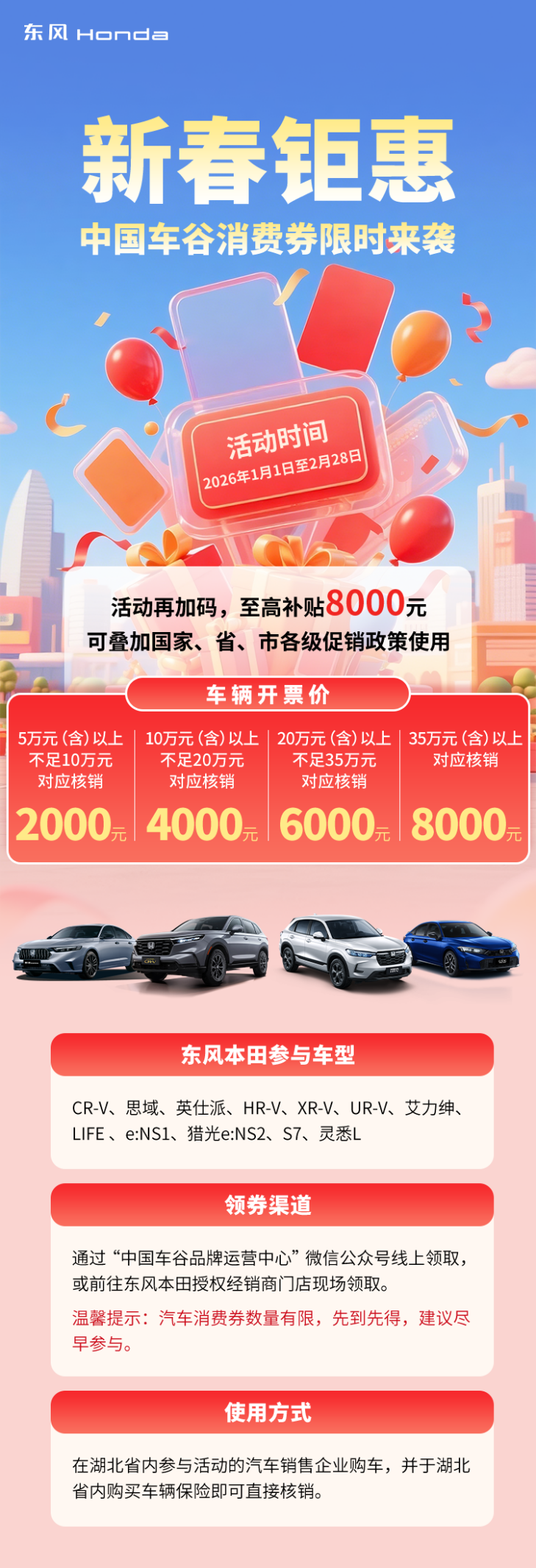 如果说东风本田的亿元红包是品牌方的真诚让利,那么同步启动的2026年车谷汽车消费券,则是来自地方政府的重磅加码。根据官方政策,2026年1月1日-2月28日期间,在湖北省内购买CR-V、思域、英仕派、HR-V、XR-V、UR-V、艾力绅等车型,即可根据车辆开票价格享受2000元-8000元的阶梯式消费券补贴。品牌优惠叠加车谷消费券,让此时成为一年中最值得入手新车的时间节点。