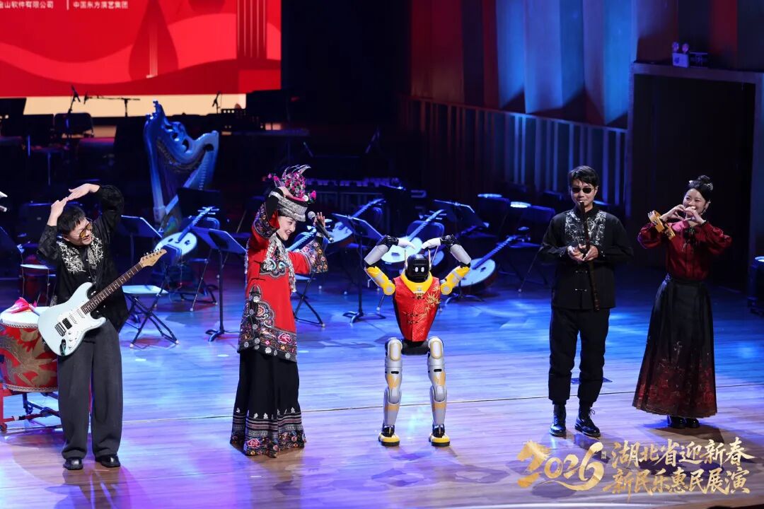 光谷东智研发的“汉产”智能人形机器人也登台演出,一出场就牢牢抓住了观众席的目光。原生态吟唱、电子编曲与机器人程序响应相辅相成,诠释出充满未来感的国乐新声。退场时,机器人的比心、飞吻等动作,更是令观众们忍俊不禁。