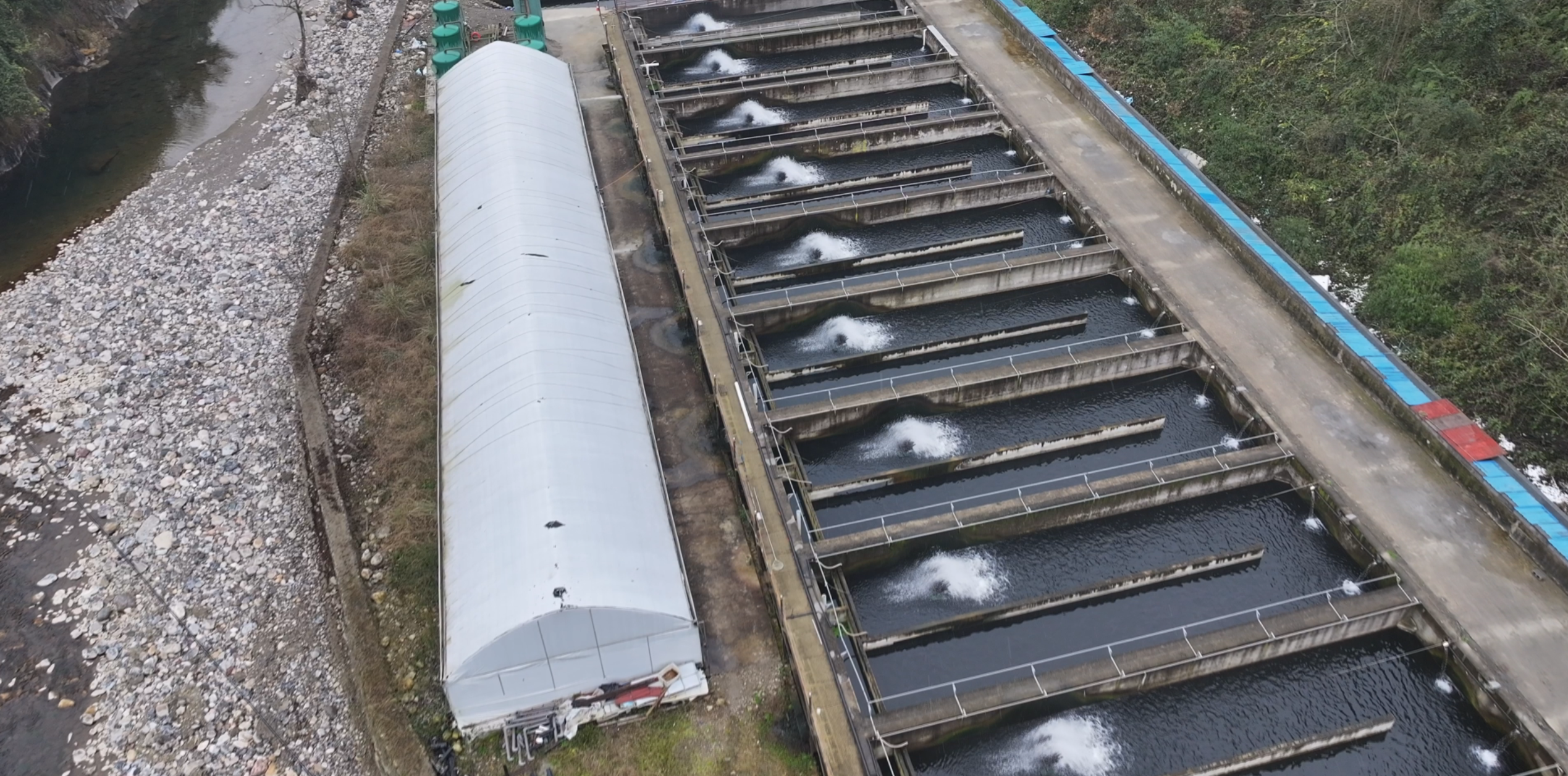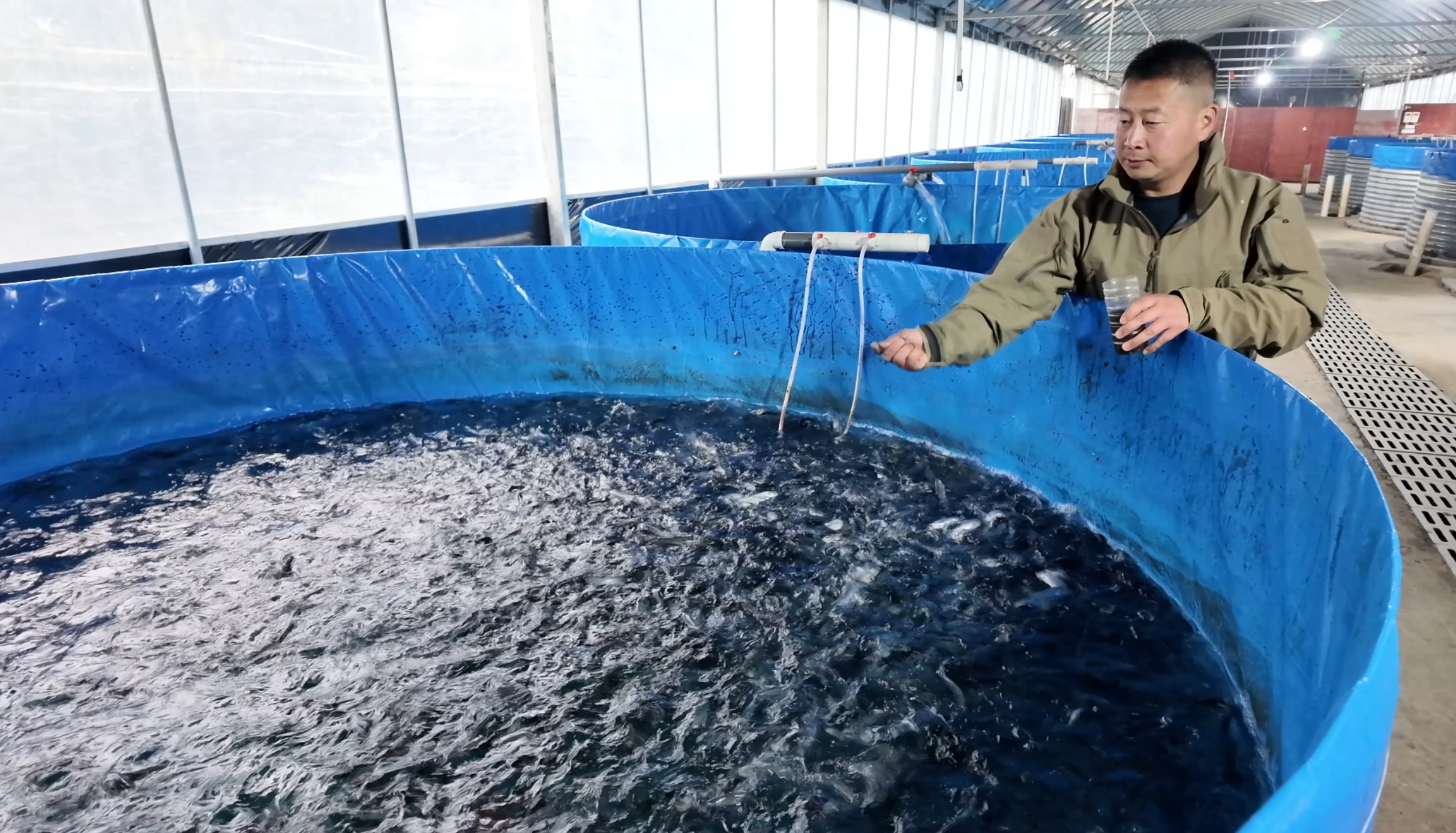 鱼池另一侧的大棚内,则有18个大型鱼盆,5万尾鱼苗正在生长。再过两个月,这些鱼苗就可以转移到鱼池内进行养殖。