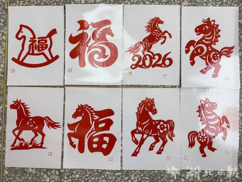 “我剪的是马和‘福’字在一起,寓意‘马上有福’。”学生叶灵浠举起自己的作品,笑容洋溢。旁边的刘镒娇则展示一匹驮着金元宝的小马:“这是‘马上有钱’,祝大家新年财源滚滚。”喻雅琪剪的是一匹奔跑的小马驹,“叫‘骏马奔腾’,希望我们都能跑进一个美好的2026。”