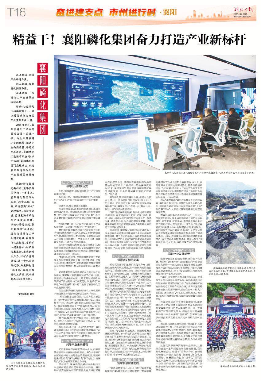 从强化资源保障到完善产业服务,从提升安全生产水平到推动绿色智能转型,襄阳磷化集团正以“精益干”的务实作风,全面推动磷化工产业向高端化、智能化、绿色化方向迈进。在襄阳奋力打造“双千亿”级现代化工产业集群、加快建设成为中西部区域性中心城市的征程中,这座磷化产业巨擘,正稳步崛起为中国磷业高质量发展的新标杆与行业典范。